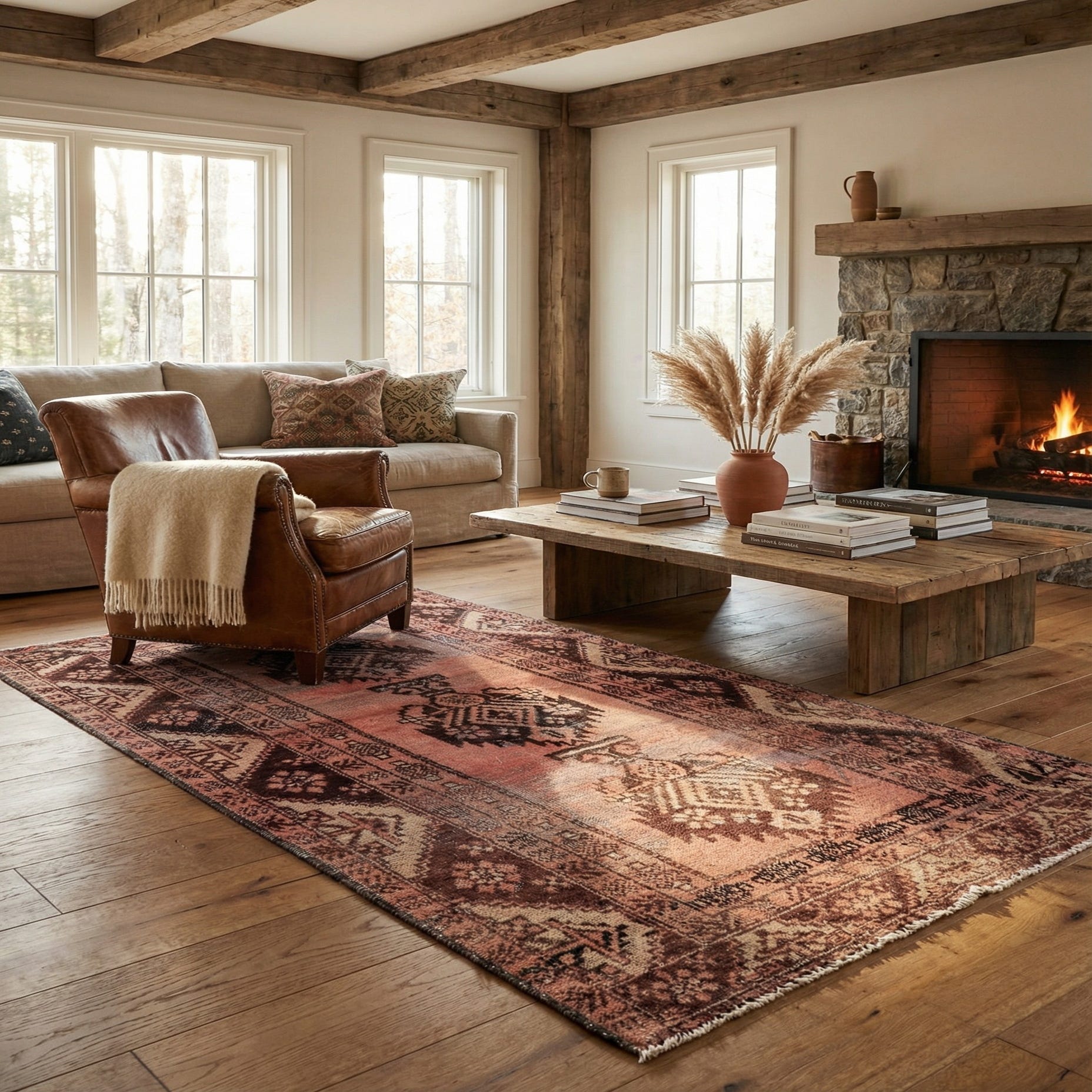 A 4x6 rectangular Ultra Vintage wool rug with a faded Persian pattern in oranges, reds, and dark brown.