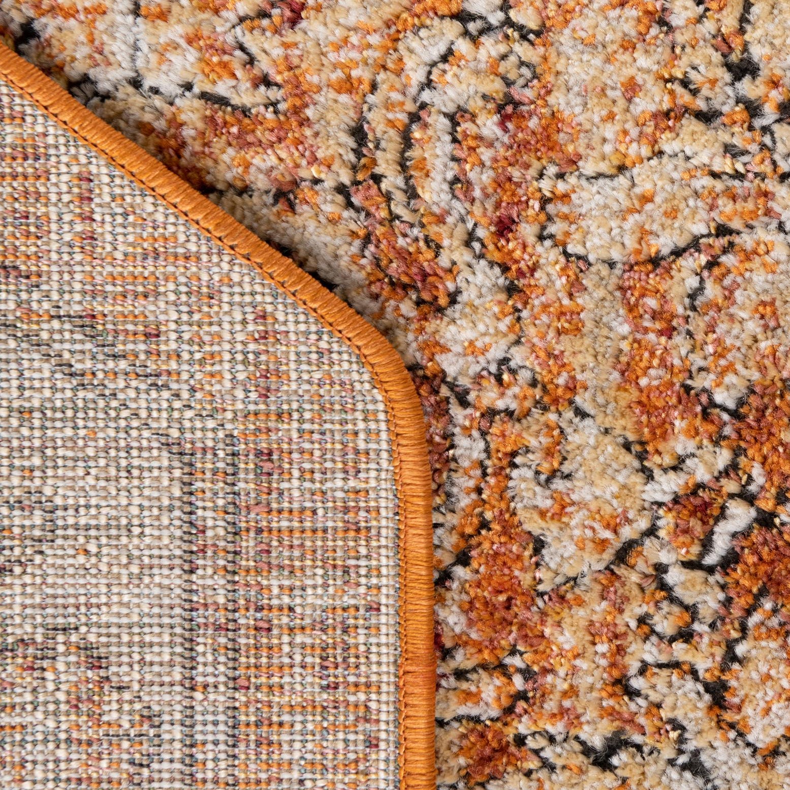 A distressed Persian-inspired medallion pattern rests on a warm rust red background, with ivory and beige fields softening the design and black outlines adding definition to the floral arabesques. Orange highlights lift the palette, creating a layered, vintage-worn look that reads both classic and casual. The octagonal silhouette gives the traditional motif a fresh, architectural twist that works nicely in compact spaces or as an accent anchor.