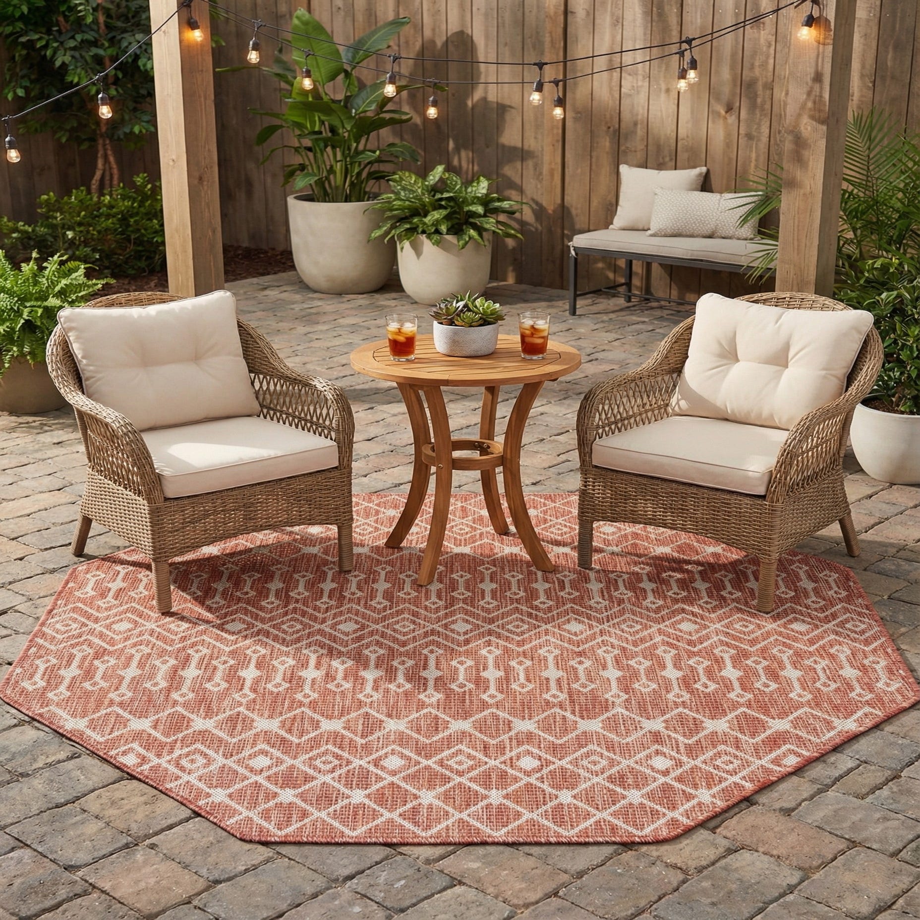 5'3" x 5'3" octagon rug in a blend of orange and red with a white tribal geometric pattern, suitable for indoor or outdoor use.