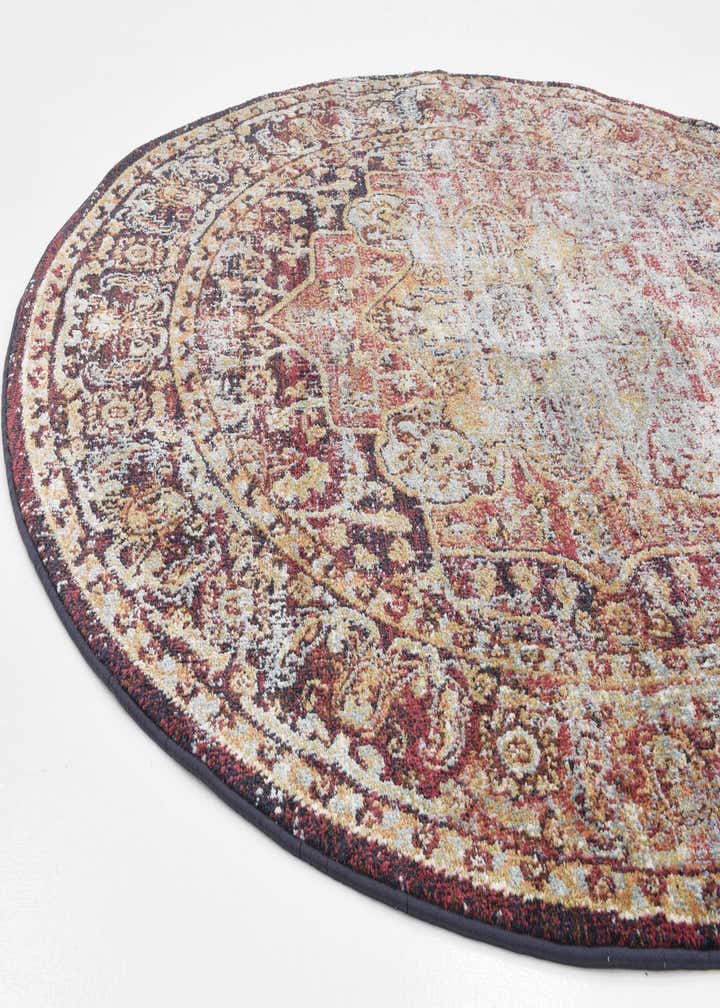 Primary color is Rust Red. Colors in this rug include: Rust Red, Blue, Brown, Ivory, Purple, Tan.