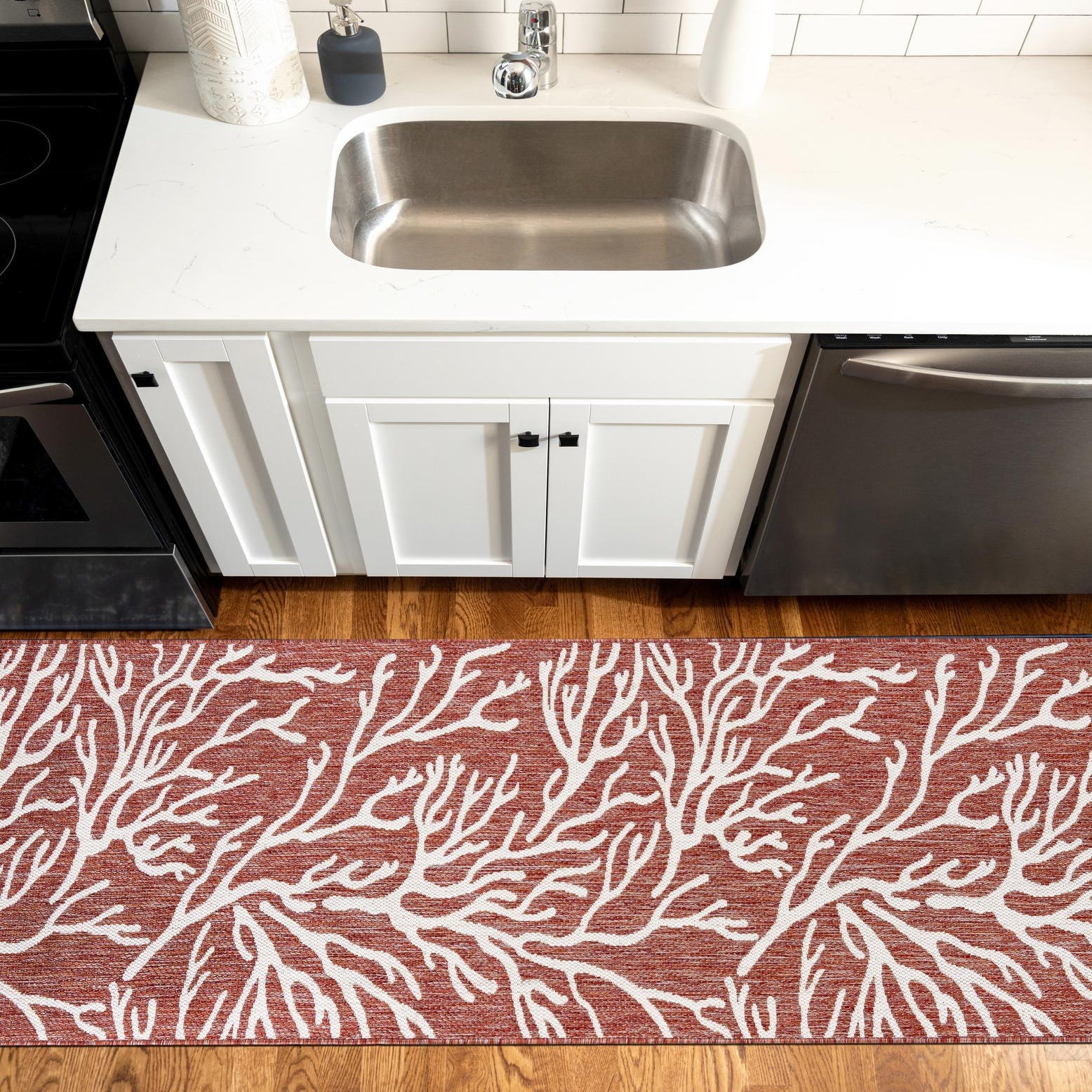 A bold coral-branch motif in ivory crosses a warm rust-red ground, creating a clear, organic pattern that draws the eye along the length of the runner. Machine made from 100% polypropylene, the surface is low-profile and flatwoven with a subtle ribbed texture you can feel underfoot—firm, resilient, and tightly constructed so the coral pattern reads with crisp edges against the background. The contrast between the ivory branches and rust field gives the rug a clean, coastal-inspired look with a modern sensibility.