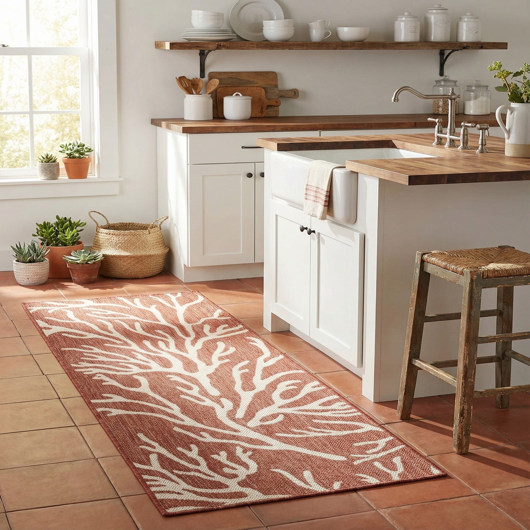 A bold coral-branch motif in ivory crosses a warm rust-red ground, creating a clear, organic pattern that draws the eye along the length of the runner. Machine made from 100% polypropylene, the surface is low-profile and flatwoven with a subtle ribbed texture you can feel underfoot—firm, resilient, and tightly constructed so the coral pattern reads with crisp edges against the background. The contrast between the ivory branches and rust field gives the rug a clean, coastal-inspired look with a modern sensibility.