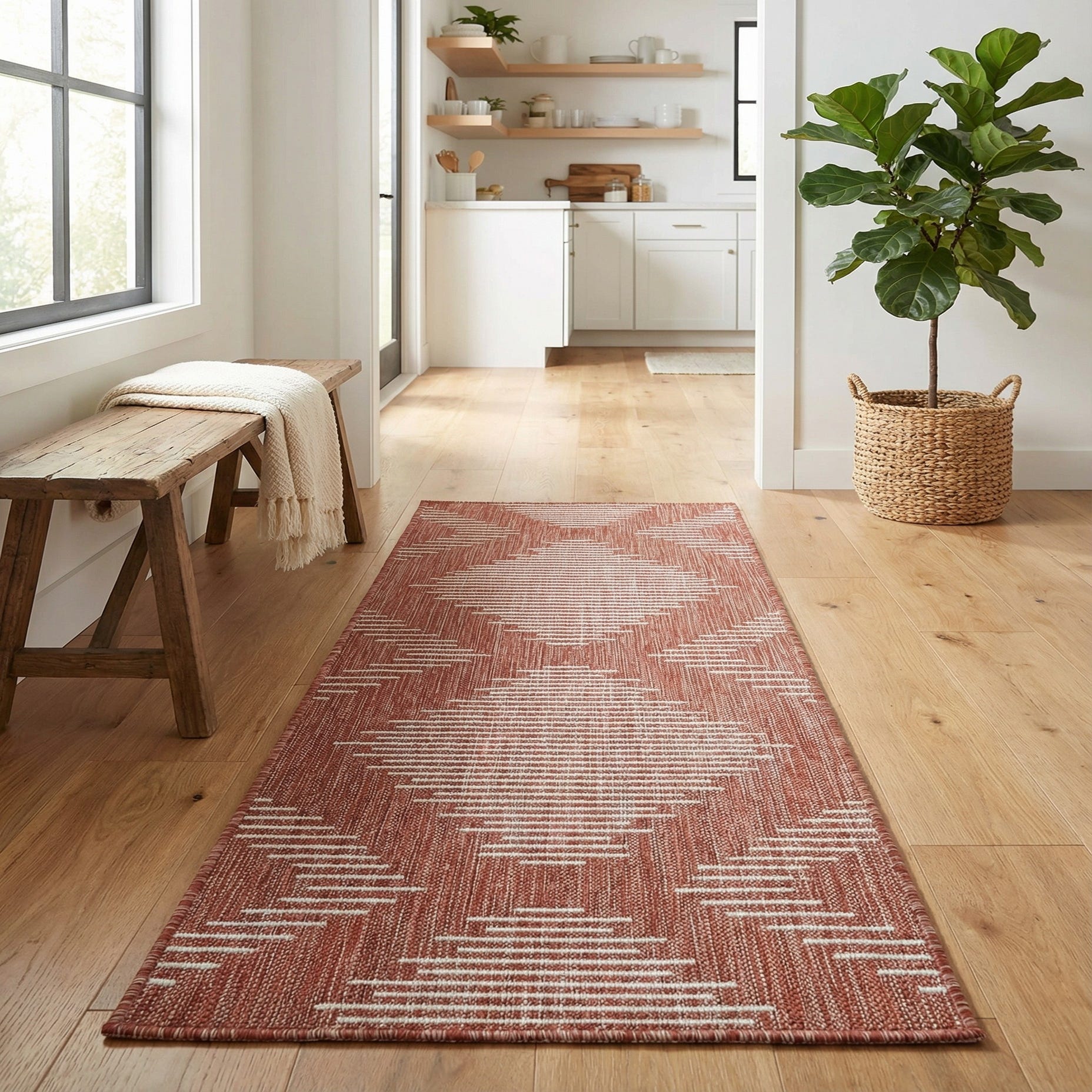 As a pet-friendly and shed-free rug, it will cater to the needs of households with pets, simplifying upkeep without sacrificing style. Due to its resilient material and construction, this runner is well-suited for both outdoor and indoor environments, such as balconies, patios, entryways, hallways, and kitchens, where its pattern and colors can complement natural elements, minimalist decor, or modern furnishings.
