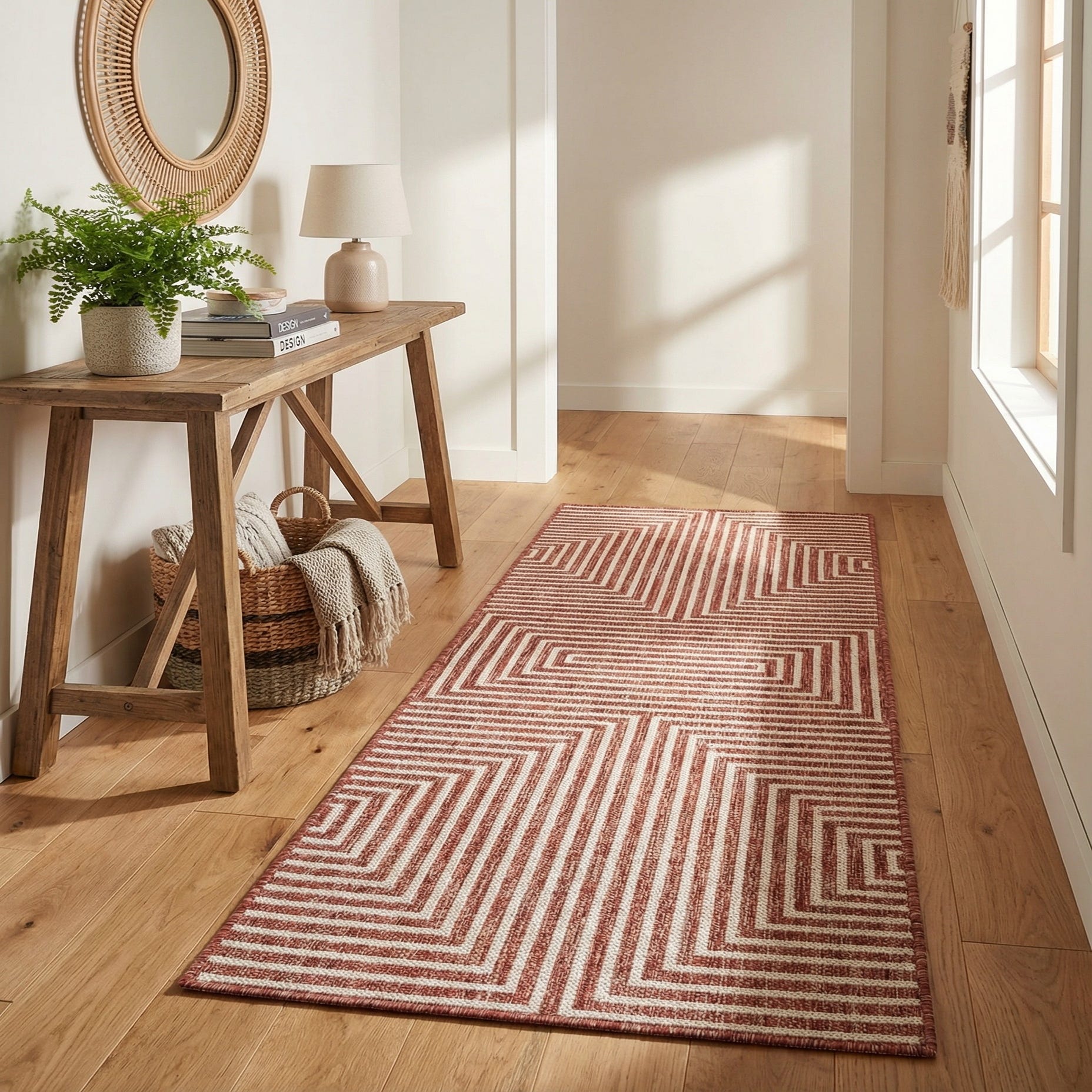 A 5 ft runner rug featuring a modern abstract pattern of interlocking geometric rectangles in varying shades of orange and red, suitable for hallways or patios.