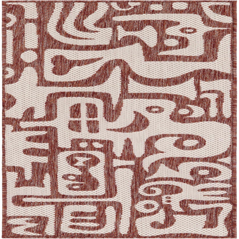 A 5 ft runner rug with a modern abstract pattern in terracotta orange and off-white, suitable for hallways or patios.