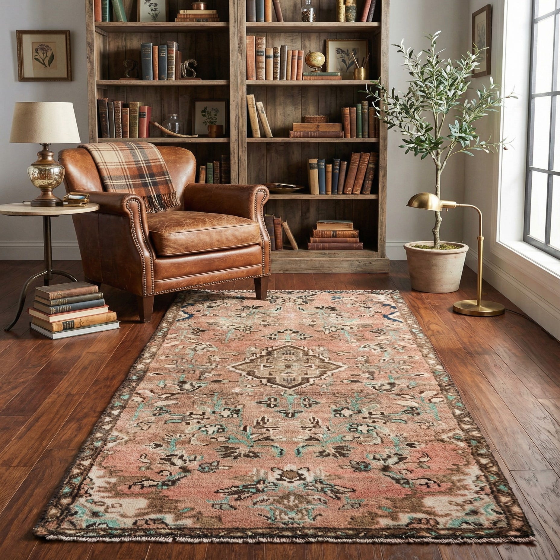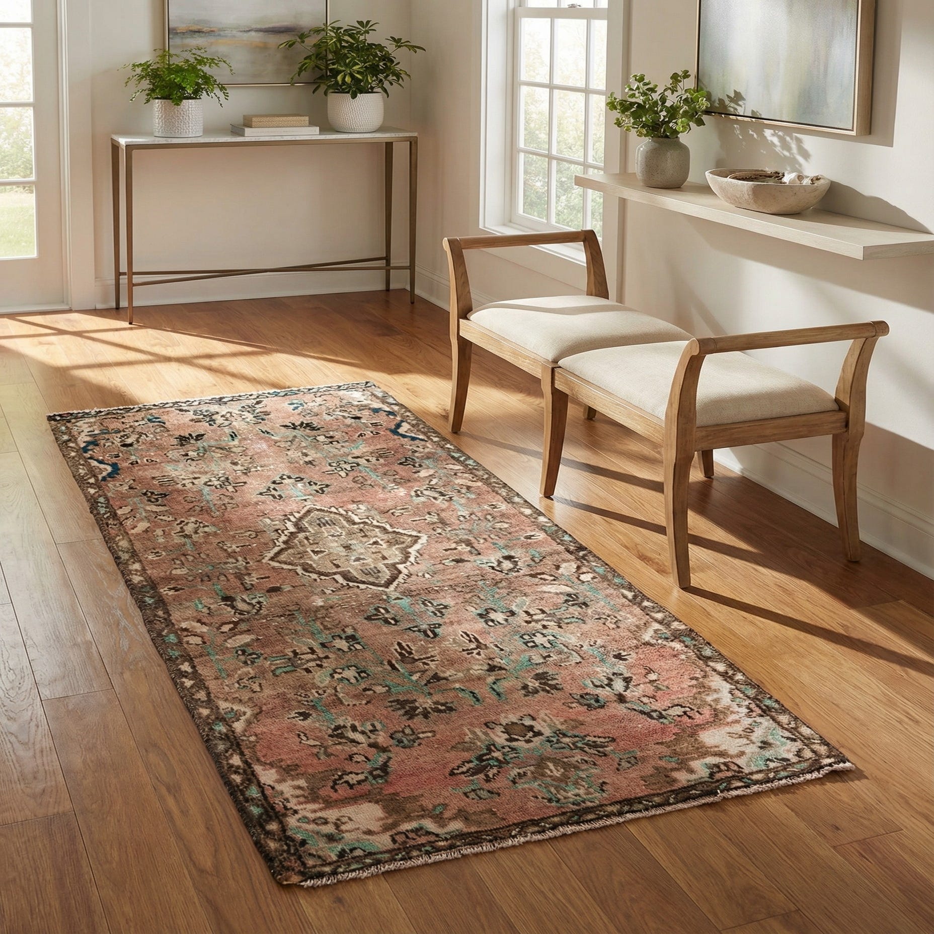 In terms of interior design, this runner rug would be particularly effective in spaces that blend antique with contemporary elements, such as an industrial loft or a modern farmhouse. It can also serve as a warm anchor in minimalist decors or as a sophisticated accent in more traditional homes. The rich colors and complex pattern make it a versatile addition to personal or professional spaces that seek to convey a refined aesthetic.