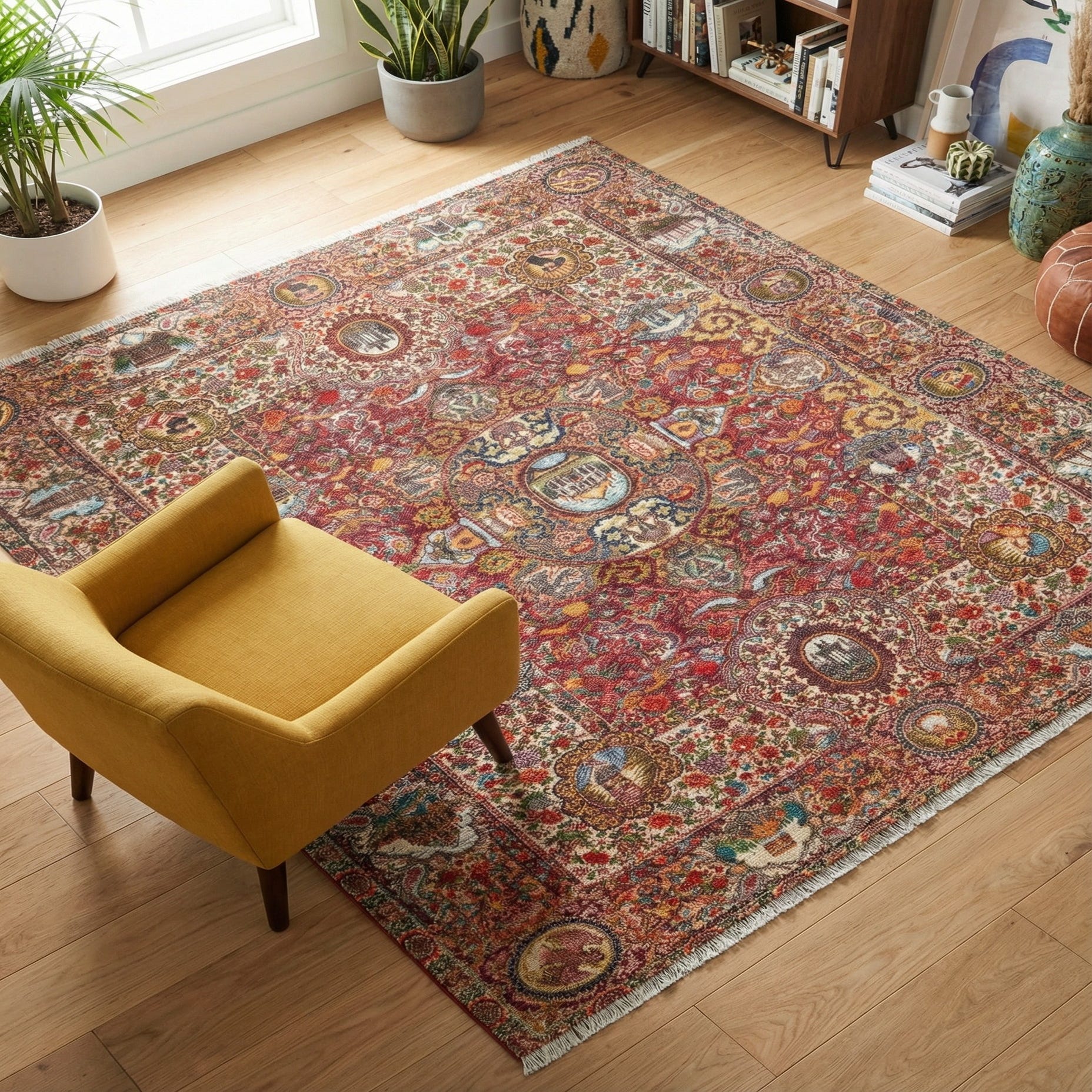 This piece works well under a low coffee table to define a living room seating area, at the foot of a bed to add warmth and pattern to a bedroom, or layered in a study or reading nook alongside leather seating and warm wood tones. Pair it with neutral linens or deep navy upholstery to let the rug’s palette become the room’s focal point, or use it to add color and texture in an eclectic or traditionally styled interior.