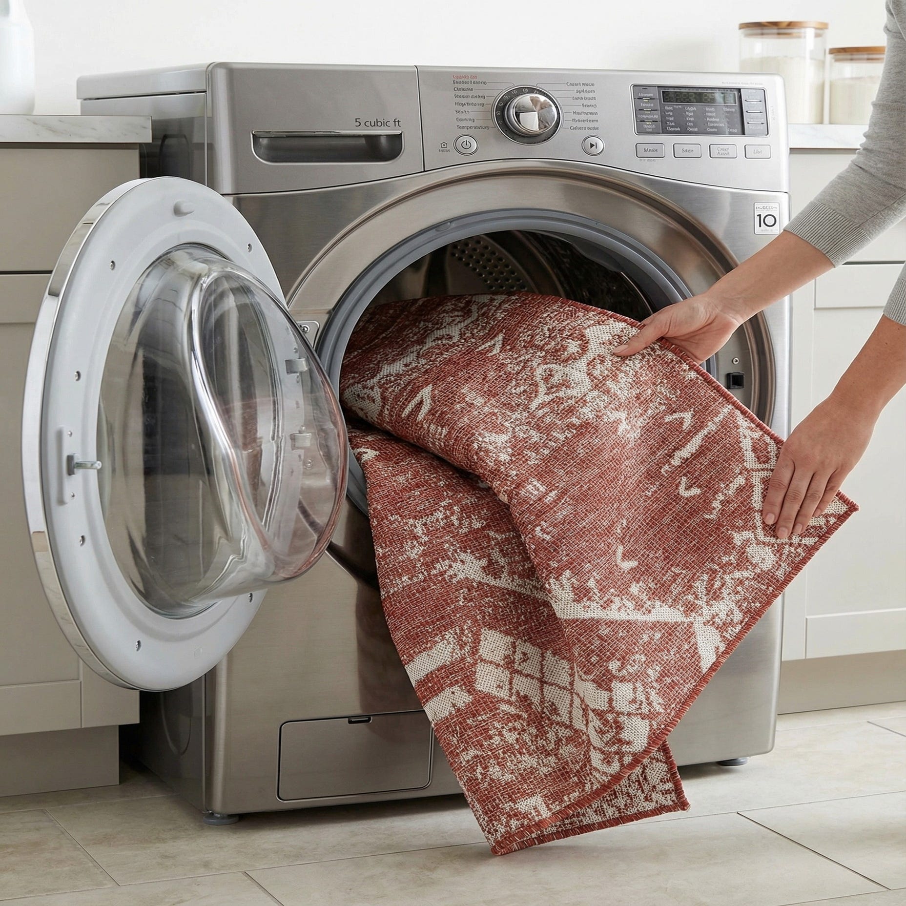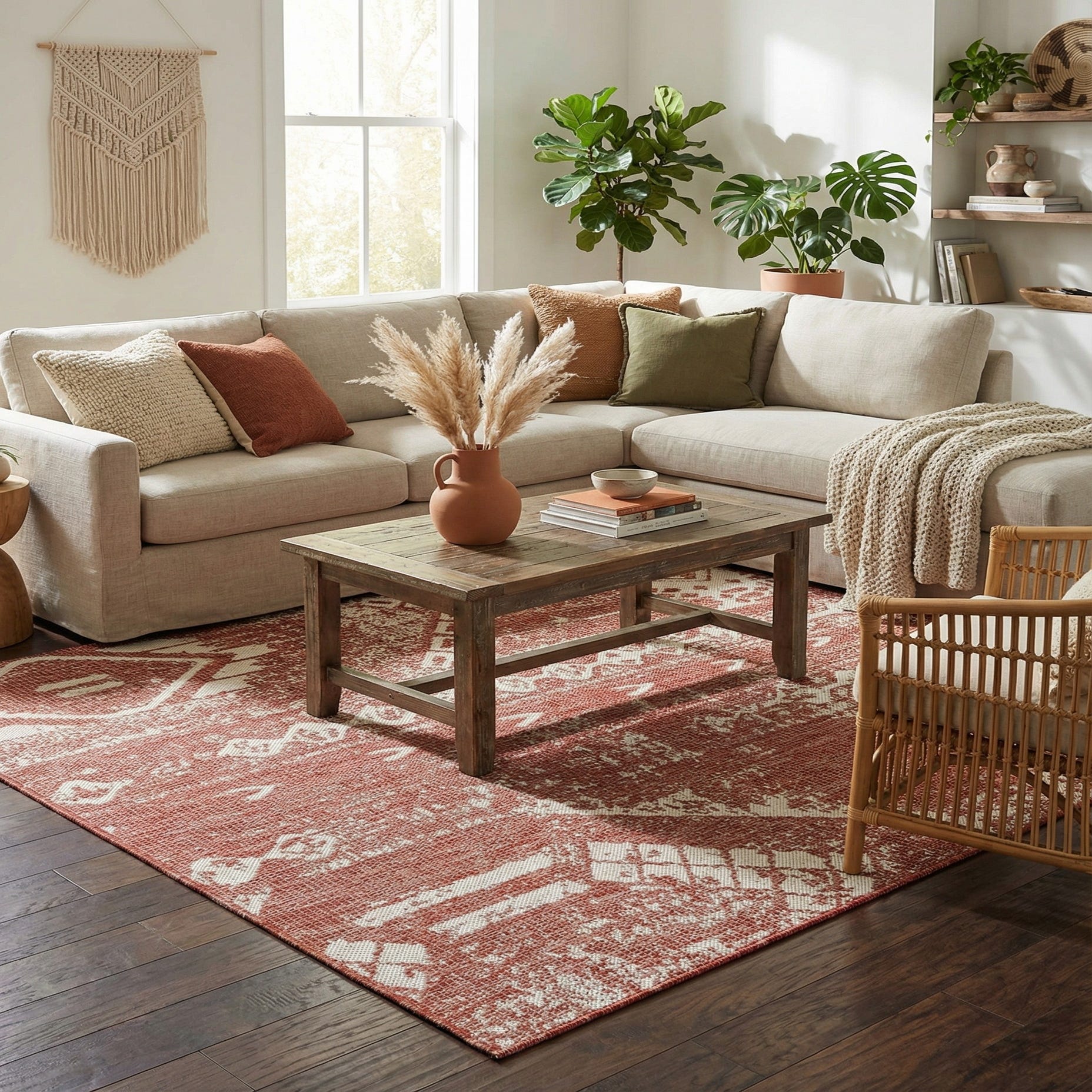 Machine-made of 100% polypropylene, this piece is suitable for outdoor settings as well as casual indoor spaces. It pairs well with rattan or teak patio furniture, neutral linen cushions and terracotta planters for a relaxed outdoor lounge, or layered under a simple wood dining table or in a sunroom framed by woven baskets and warm metal accents for a bohemian, southwestern, or farmhouse-inspired interior.