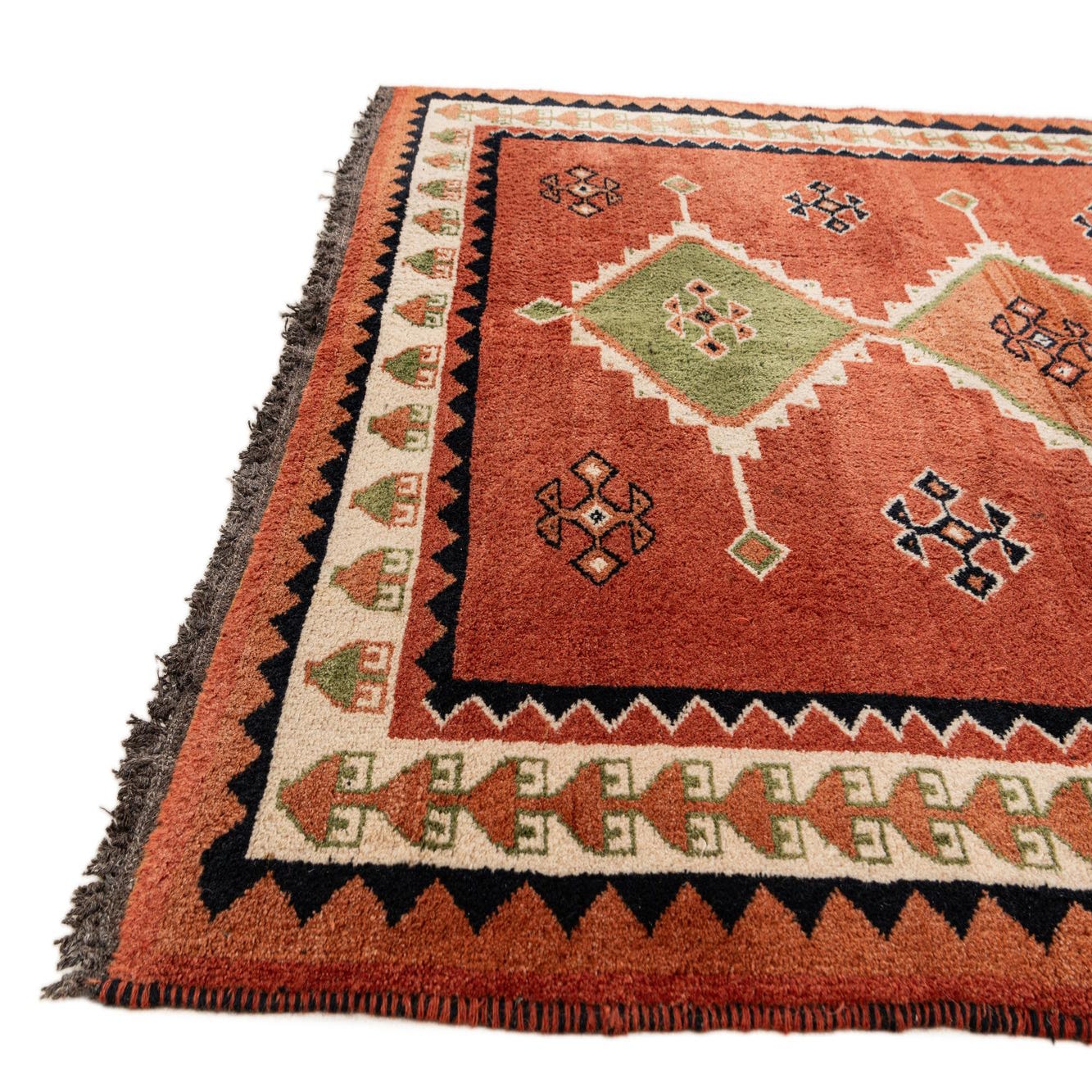 A 5x7 rectangular Gabbeh wool rug featuring a rich orange-red field with large green and cream geometric diamonds, surrounded by a traditional border.