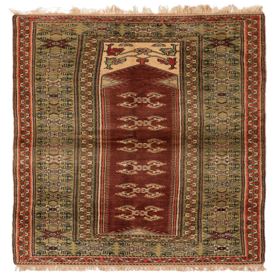 Primary color is Rust Red. Colors in this rug include: Rust Red, Beige, Black, Brown, Ivory, Olive, Peach.