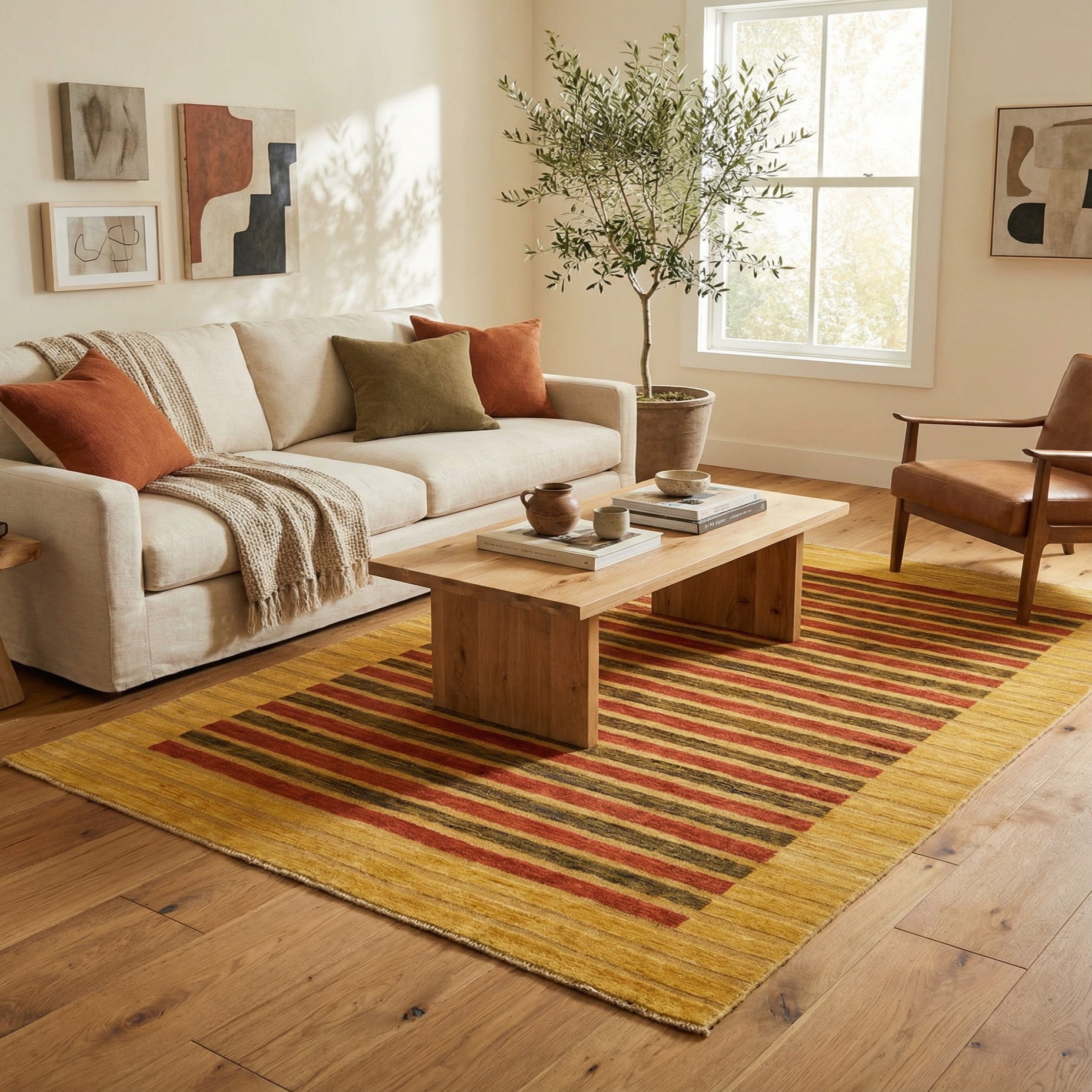 A 5x7 rectangular Modern Ziegler rug featuring a bold striped pattern in orange, red, and dark brown, with a solid orange border.