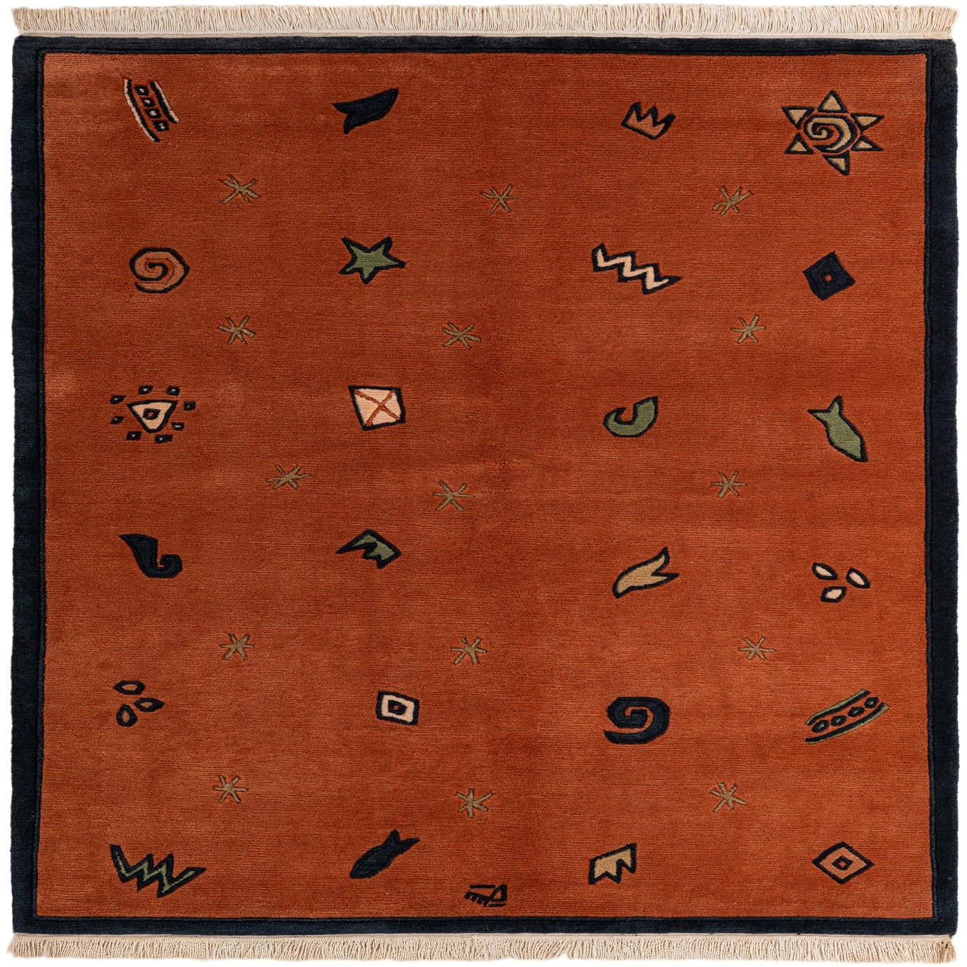 A 5x7 rectangular orange wool rug with a dark blue border and playful, colorful abstract shapes scattered across its surface.