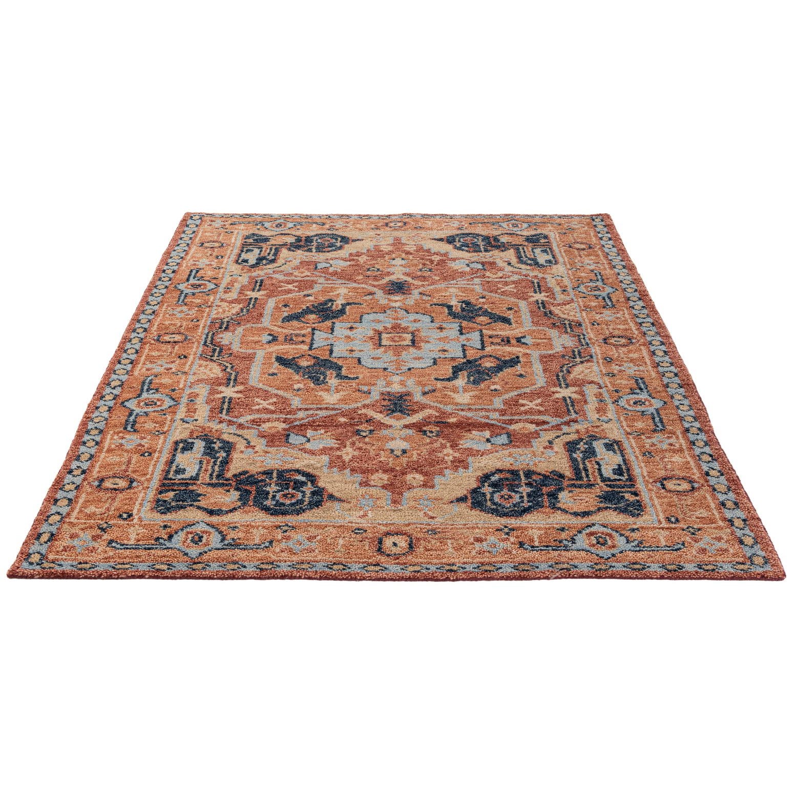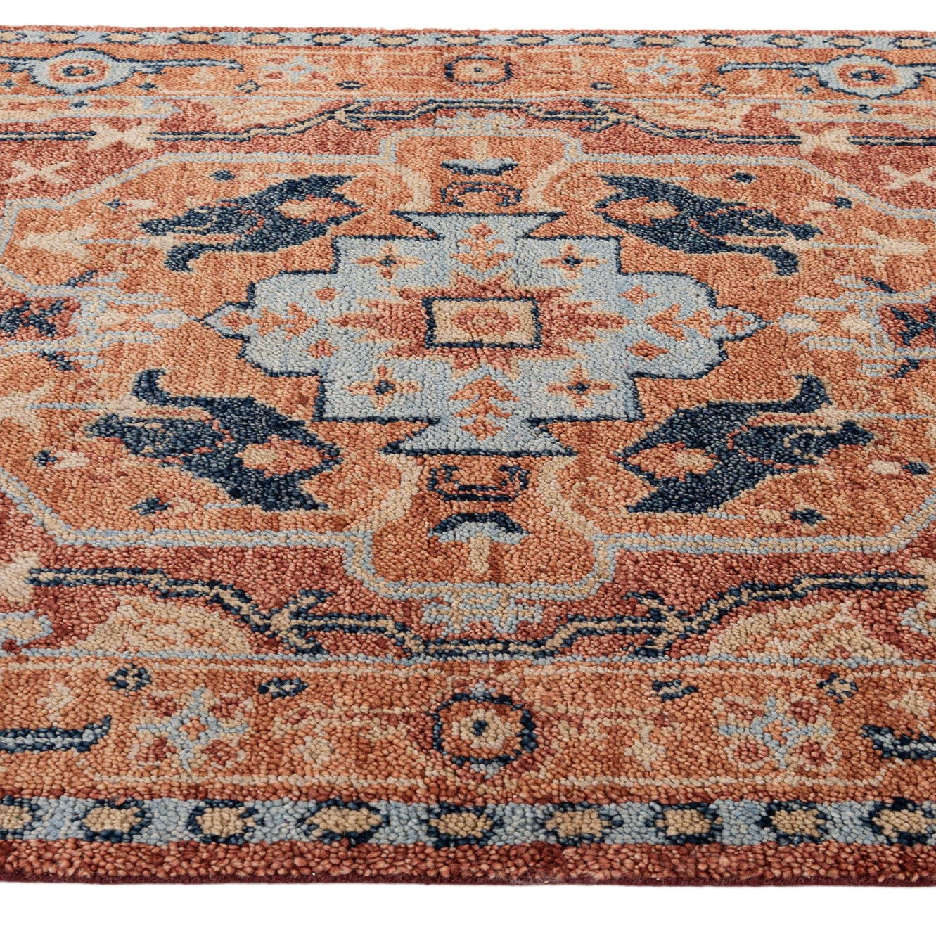 Primary color is Rust Red. Colors in this rug include: Rust Red, Navy Blue, Light Blue, Beige.