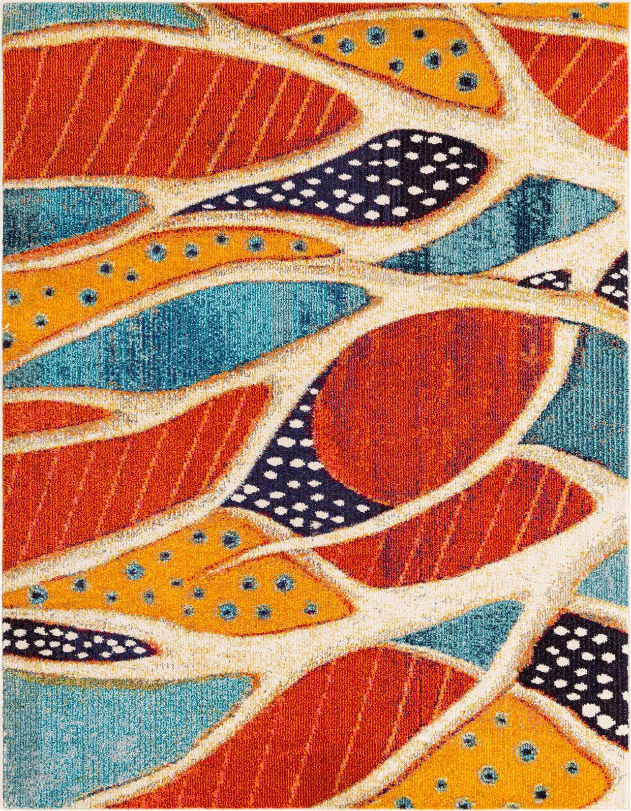 Primary color is Rust Red. Colors in this rug include: Rust Red, Beige, Blue, Gold, Green, Navy Blue, Purple, Orange.