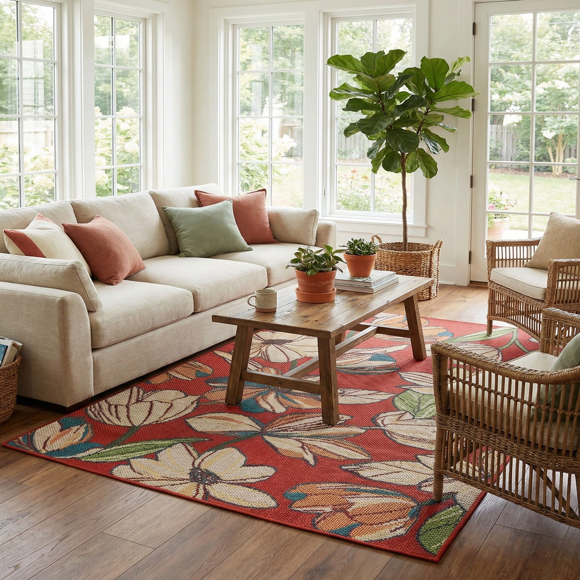A 5x8 rectangular indoor/outdoor rug with a modern floral pattern on a red background, featuring large orange, cream, and teal flowers with green leaves.