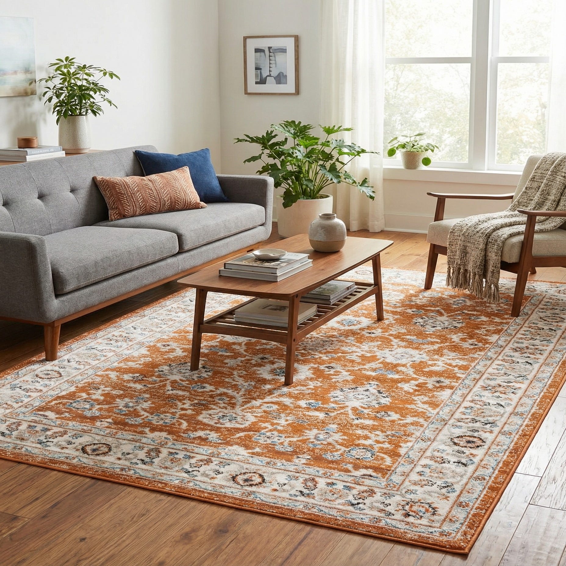 This piece works well in a range of transitional and casual interiors — place it under a seating group to anchor a living room with neutral upholstery and wood tones, or use it beneath a dining table where the warm rust plays off brass or aged-wood finishes. It also complements layered bohemian schemes with woven throws and rattan accents, or adds color to a muted entry or reading nook alongside navy or gray accents.