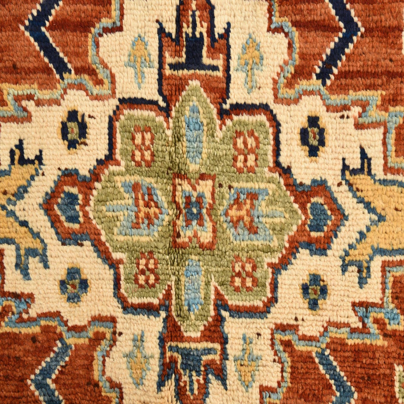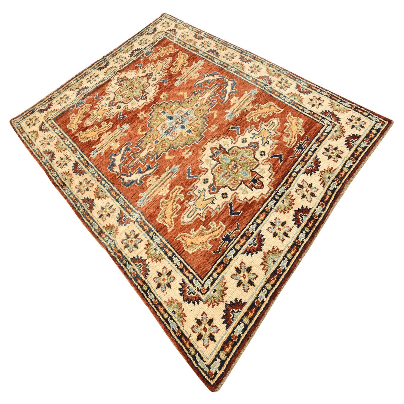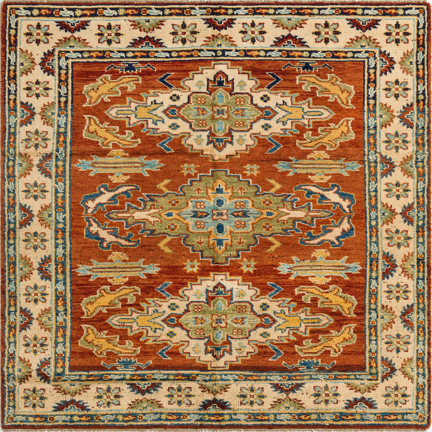 Primary color is Rust Red. Colors in this rug include: Rust Red, Ivory, Navy Blue, Olive, Yellow, Light Blue.