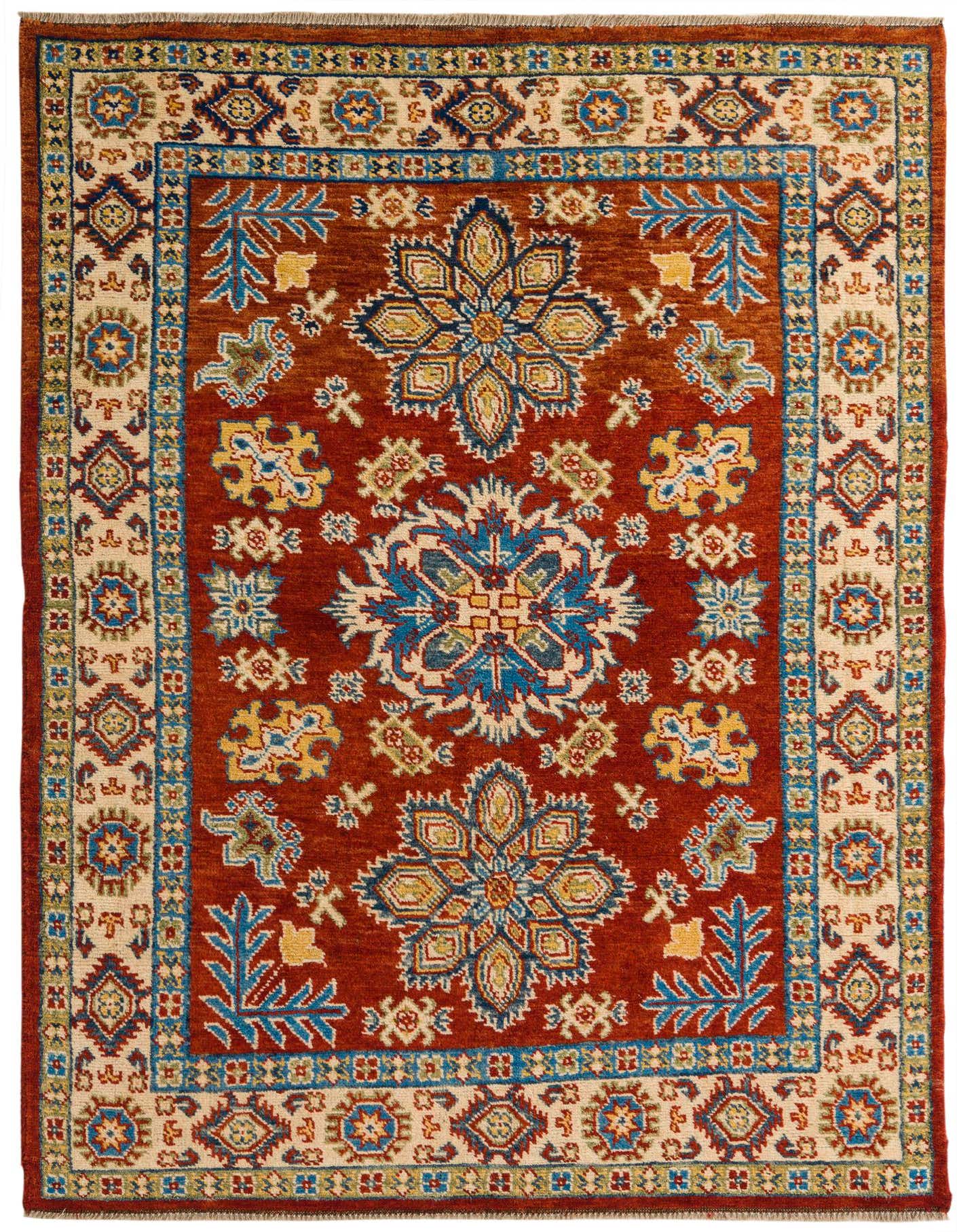Primary color is Rust Red. Colors in this rug include: Rust Red, Beige, Blue, Brown, Yellow, Ivory.
