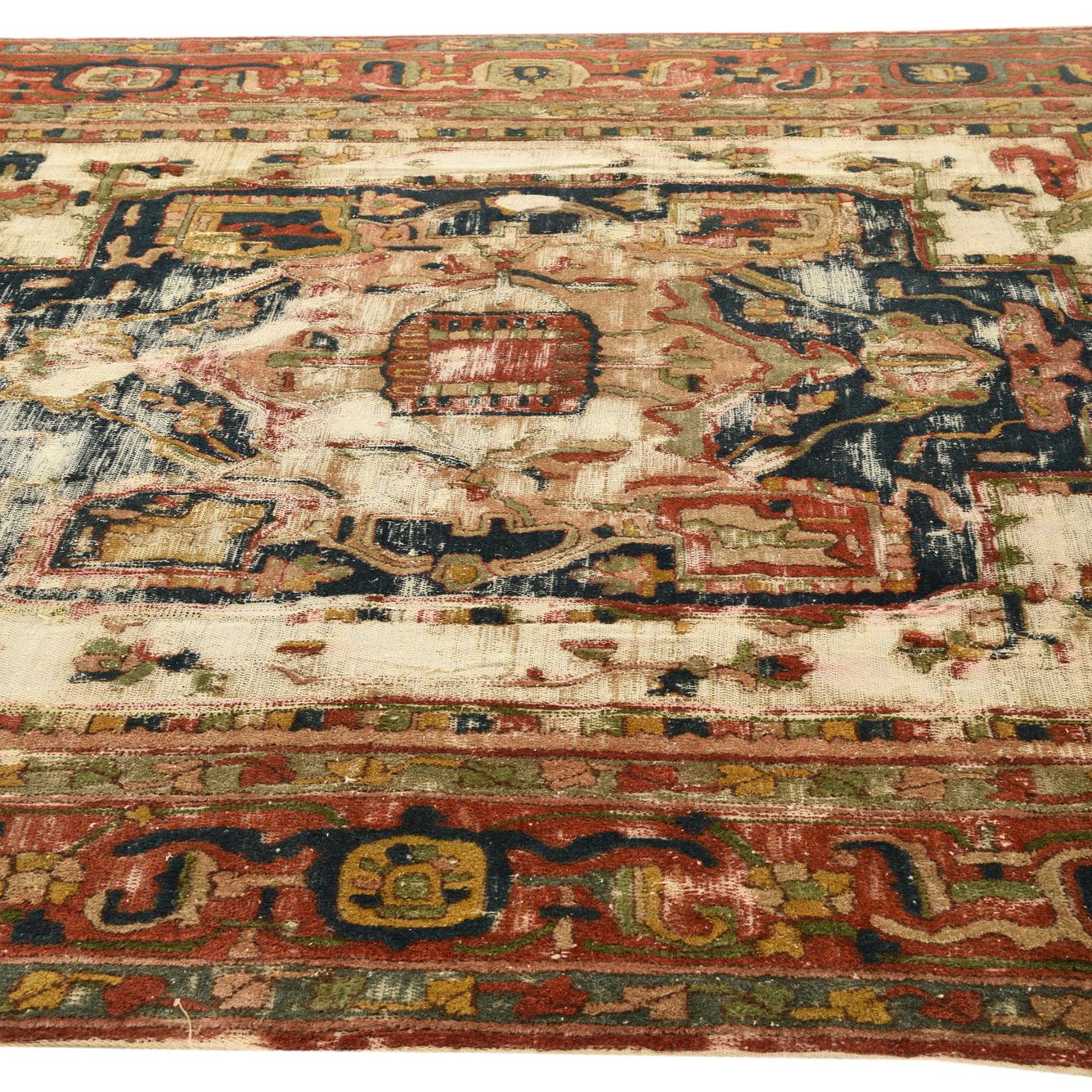 The rug's antique character is enhanced by its condition; the low pile contributes to an authentic patina, while missing fringe, small spot damage, and a hole underscore its historical journey. Despite these signs of age, such details often add to the unique charm of an antique piece.
