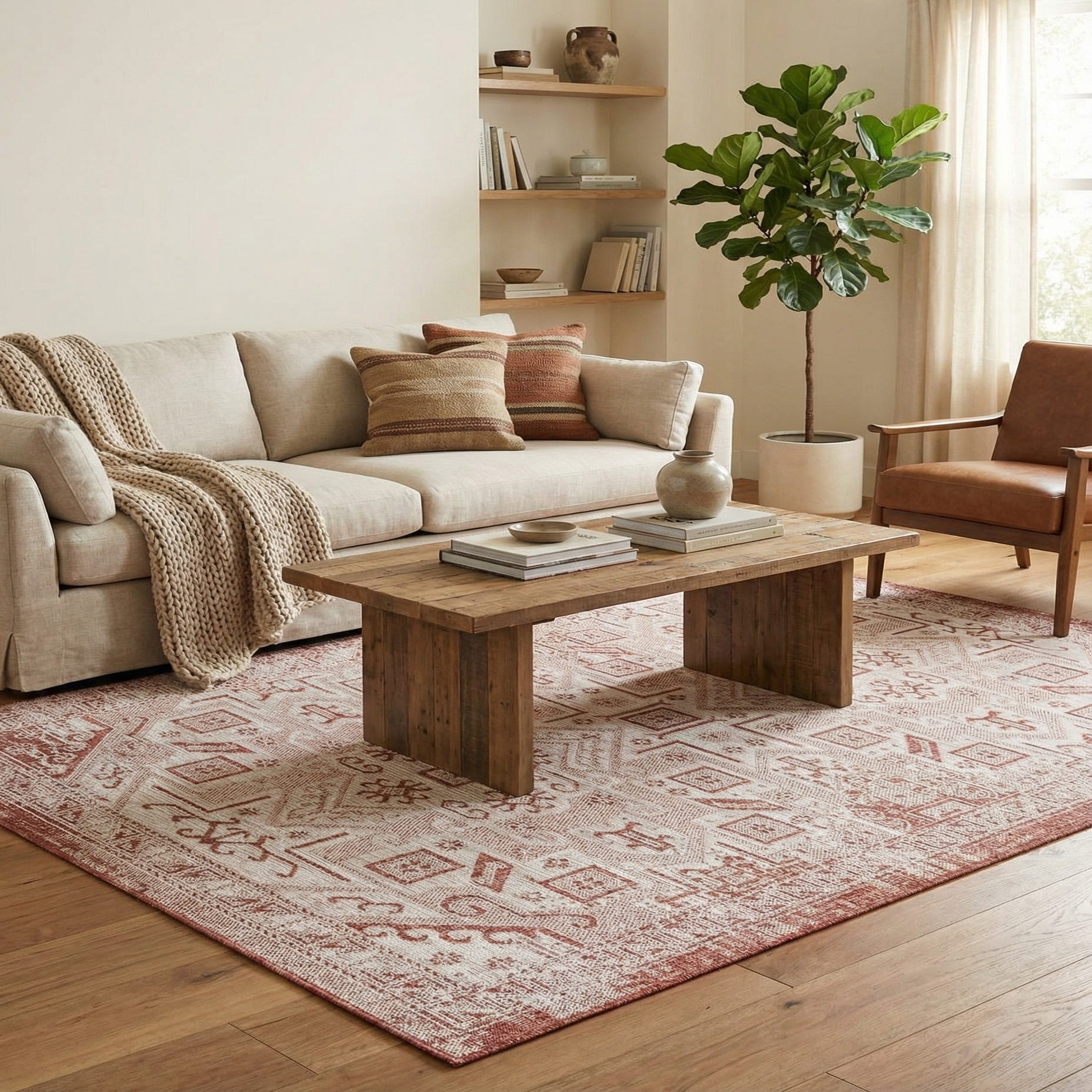 The rust red and ivory color palette can seamlessly integrate with natural stone, wood elements, and a range of outdoor furniture materials. This rug is an excellent choice for patios, decks, and sunrooms but can also provide warmth and character to living rooms, dining areas, or bedrooms with rustic or Southwestern decor themes.