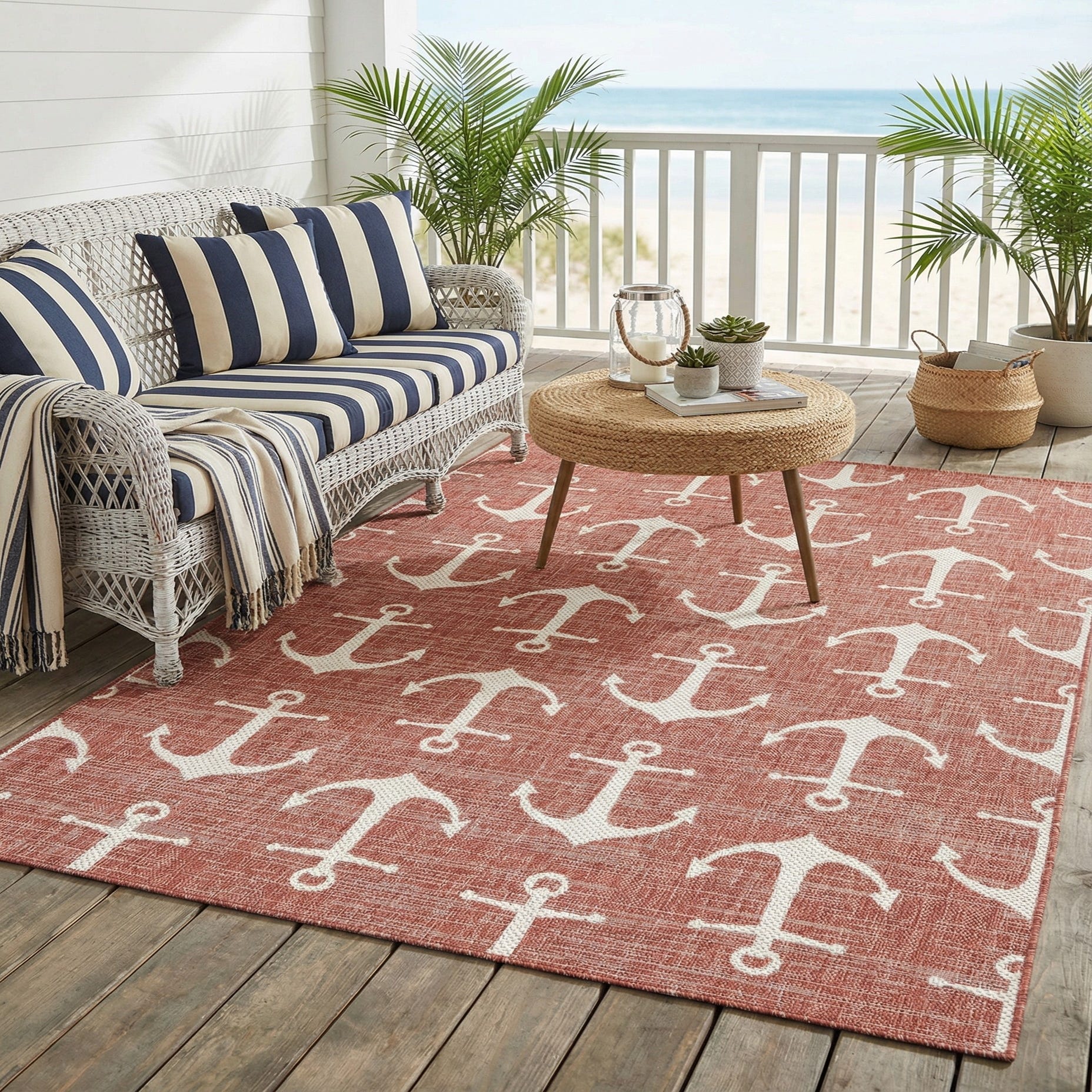 This Outdoor Coastal collection rug showcases a nautical charm with its pattern of white anchors set against a vivid rust red background. Its design conveys a sense of coastal living and sea-inspired tranquility. The machine-woven construction from 100% polypropylene ensures a durable, flatweave texture that is both pet-friendly and stain-resistant.