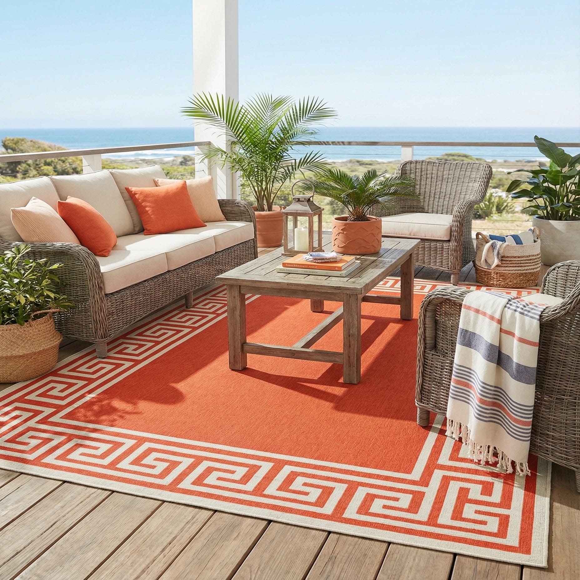 A 5x8 rectangular orange rug with a bold white Greek key border, suitable for indoor or outdoor use.