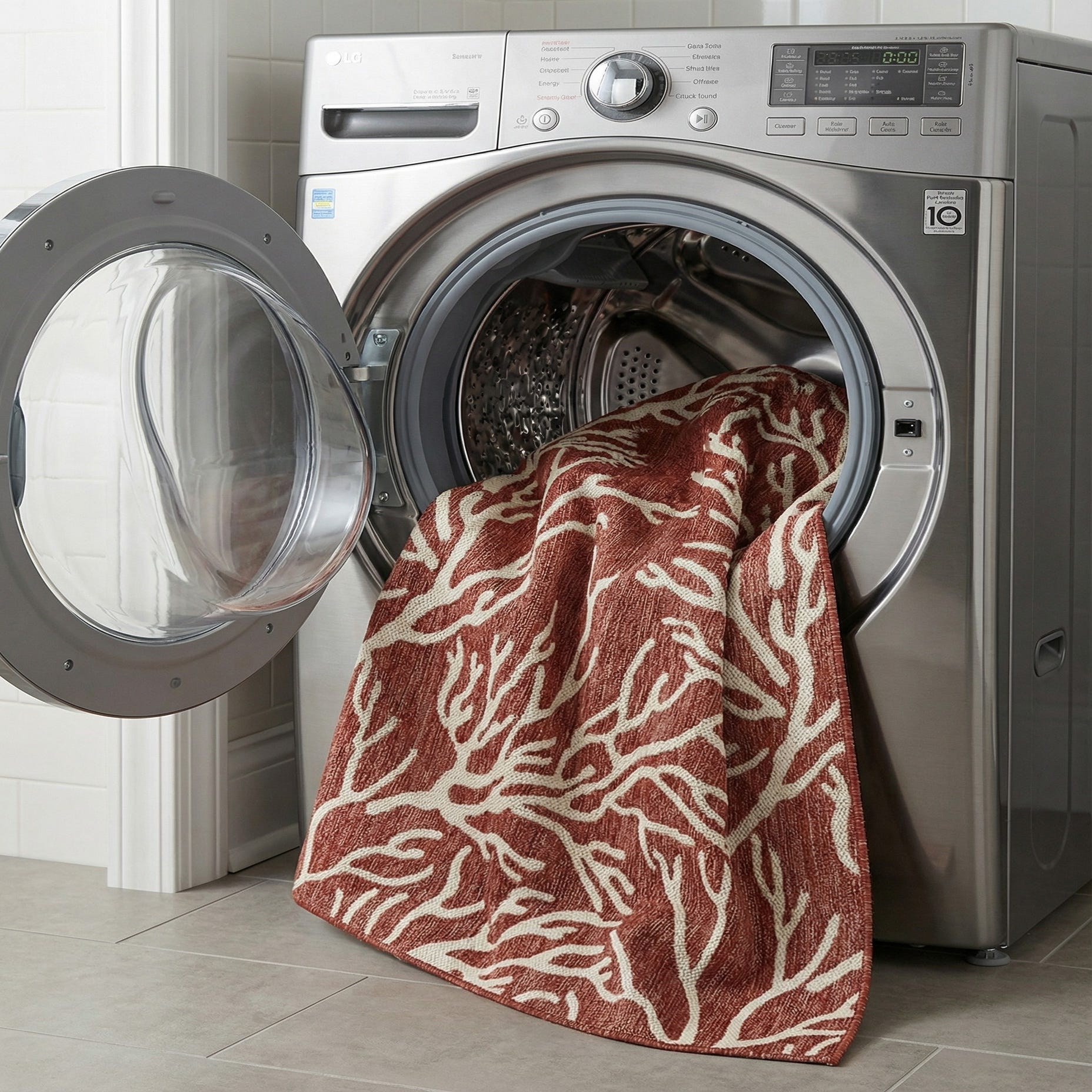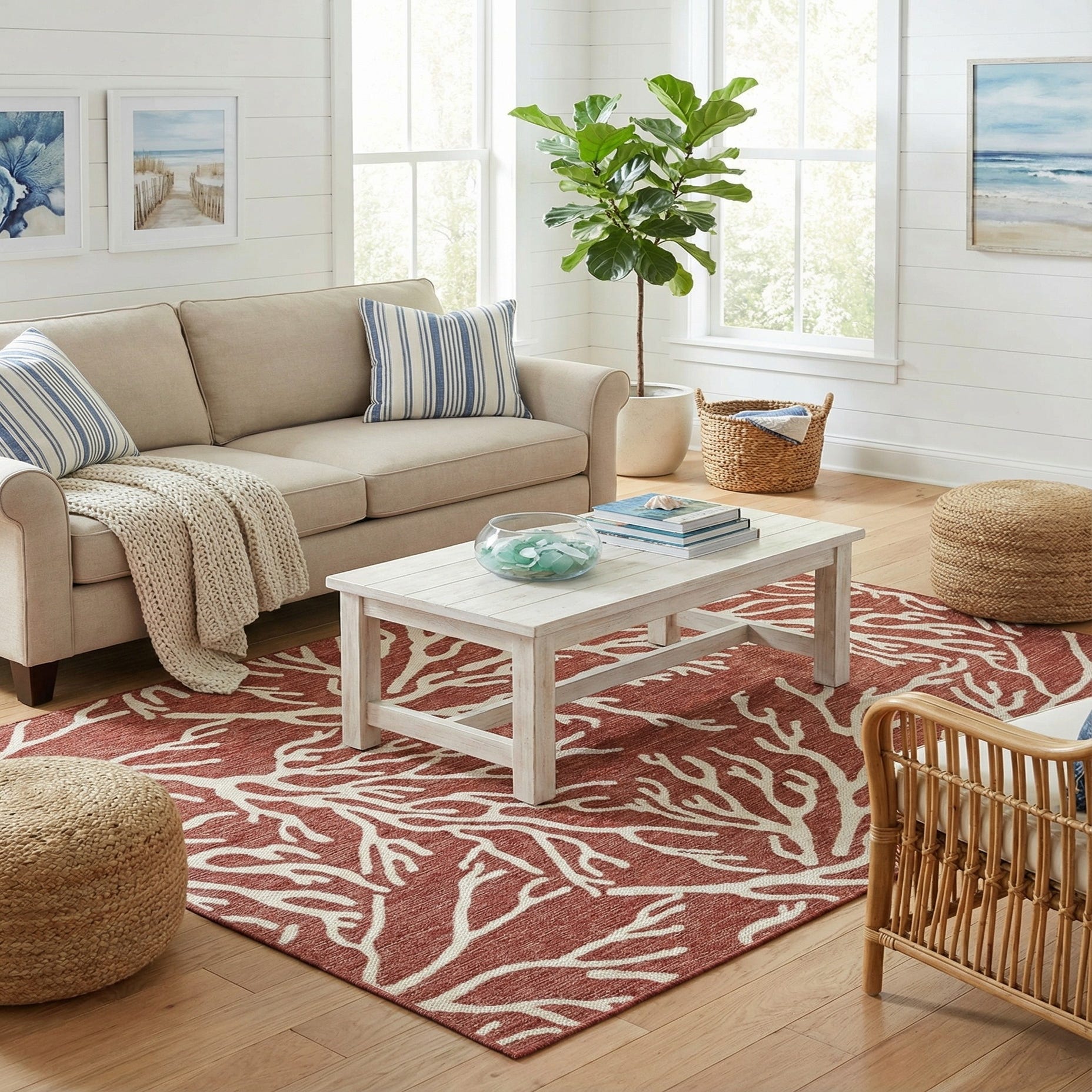 The Outdoor Coastal Collection offers a durable and stylish 5x8 area rug that combines a marine-inspired aesthetic with practical design. This machine-woven piece, crafted from 100% polypropylene, features a dynamic coral pattern that brings a touch of underwater intrigue to any space. The rust red background is complemented by ivory accents, creating a striking visual contrast that captures the essence of coastal living.