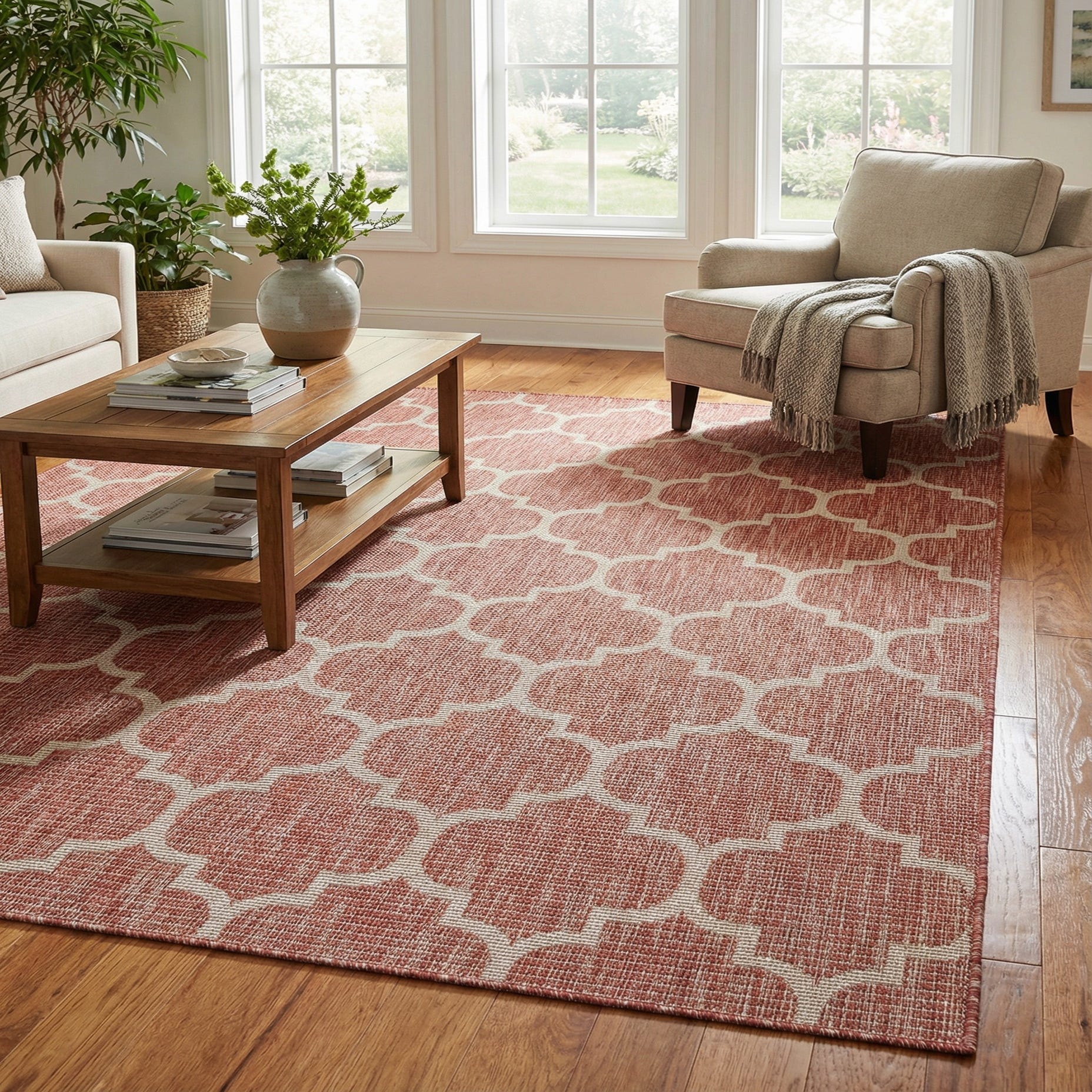 A bold rust red ground anchors a repeating beige lattice in a classic quatrefoil motif, giving the rug a structured, geometric presence with a warm, sun-warmed palette. The pattern is rendered in a tight, machine-made weave of 100% polypropylene, so the surface feels low-profile and slightly textured underfoot—more like a firm woven mat than a plush pile. The beige pattern provides crisp contrast against the rust background while the woven construction adds subtle visual depth and a tactile, linen-like touch.