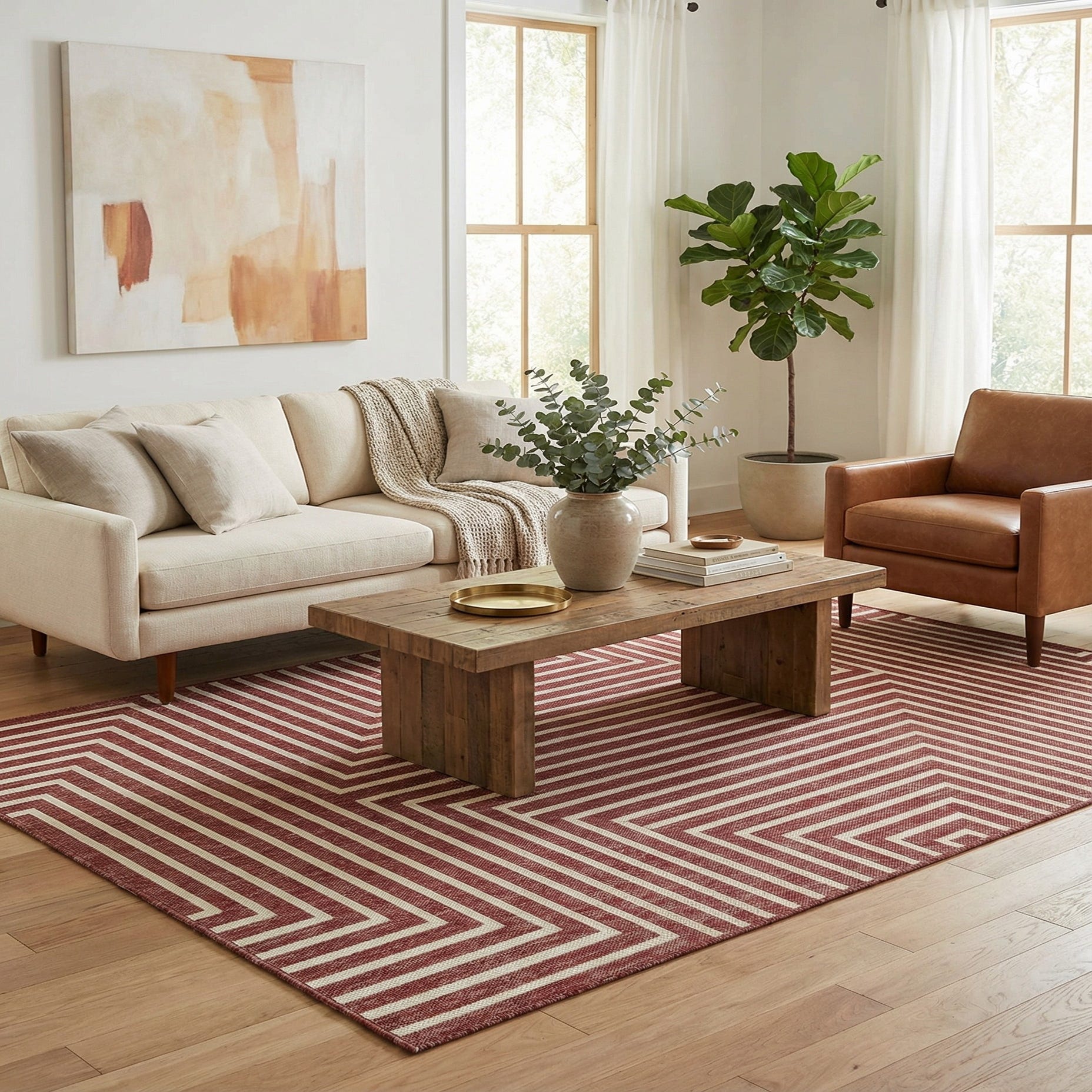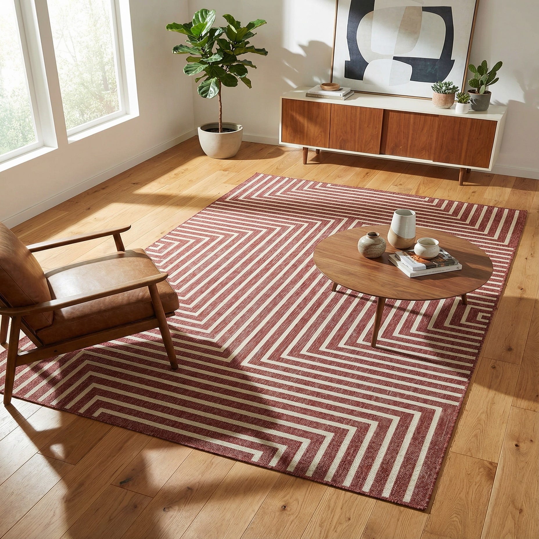 A 5x8 rectangular indoor/outdoor rug featuring a modern abstract pattern of thin off-white lines forming concentric squares and vertical stripes on a rich terracotta red background.