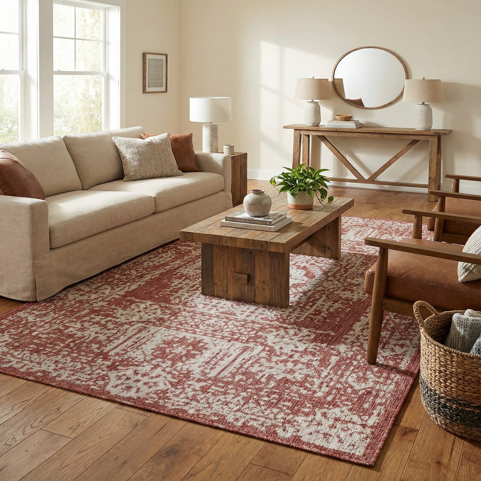 This piece fits naturally on a covered patio or sunroom where a warm, grounded color palette is desired, and it also works well inside an entry, dining area, or casual living room to add pattern without heavy pile. Pair it with warm wood tones, neutral wicker or rattan seating, and simple metal accents for a balanced, relaxed look; it also complements light-gray upholstery or linen fabrics to echo the rug’s gray motifs.