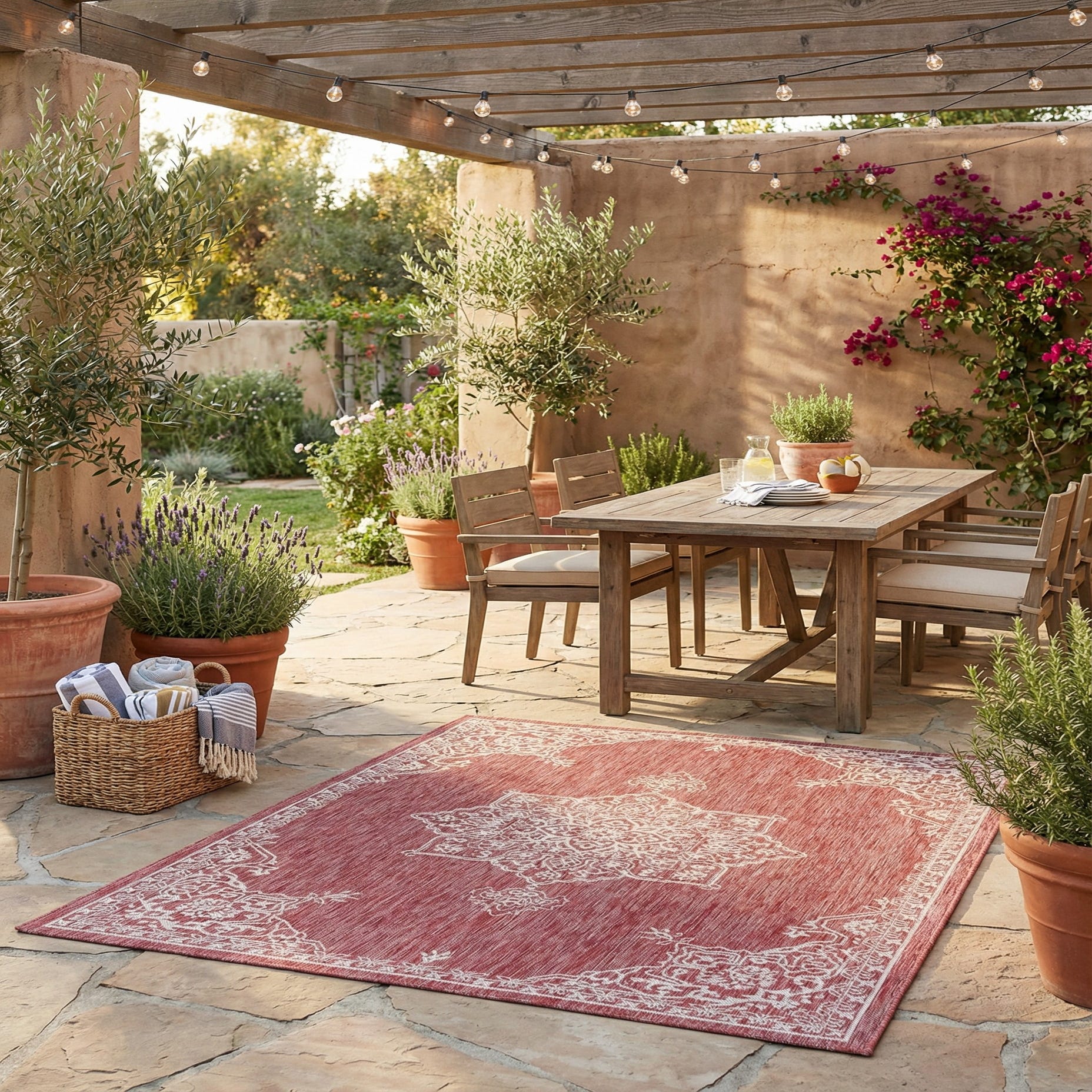 Machine-made from 100% polypropylene, this rug is suitable for outdoor spaces and high-traffic rooms indoors. It pairs naturally with weathered wood dining sets on a covered porch, wicker seating and linen cushions in a sunroom, or a leather sofa and brass accents in a casual living room. Use it to anchor a seating area, define an outdoor dining spot, or add color and pattern to an entryway.