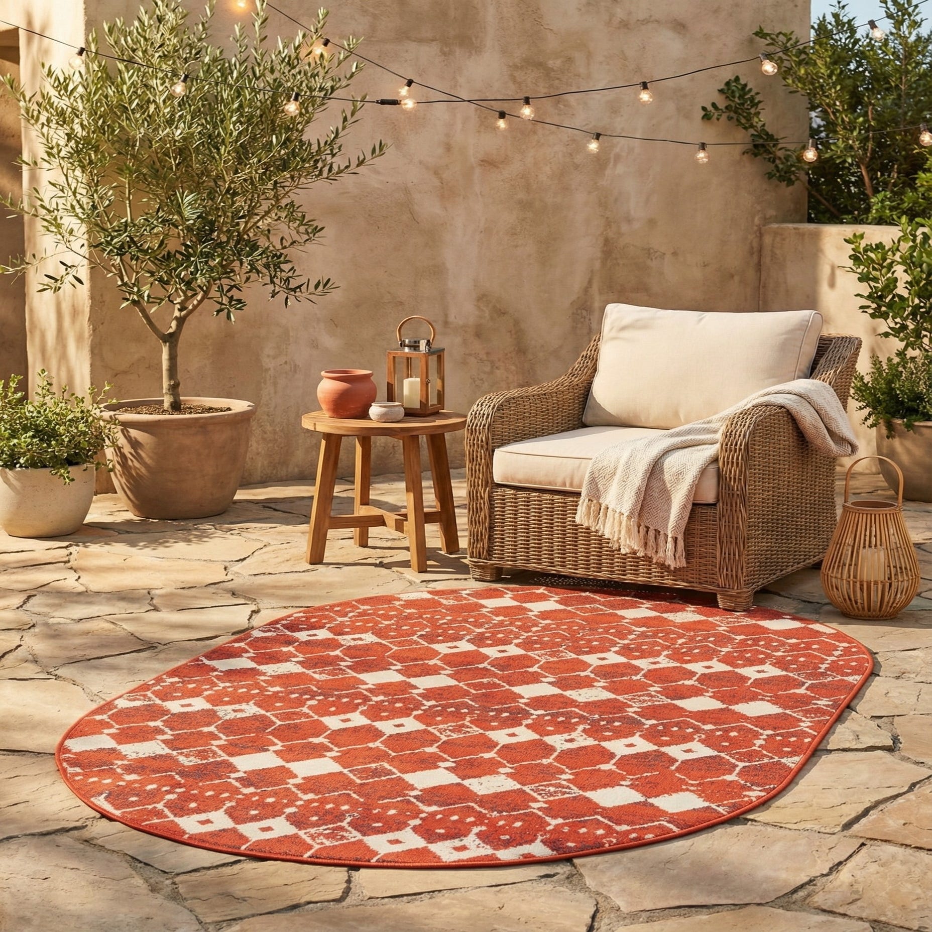 This rug suits outdoor living areas and transitional indoor spaces alike — think a covered patio or sunroom anchored by light-wood seating, a small bistro setup on a balcony, or an entryway that benefits from an oval accent. Pair it with navy cushions, ivory throw pillows, and natural wicker or rattan pieces to balance the warm rust tone and emphasize a relaxed, layered look.