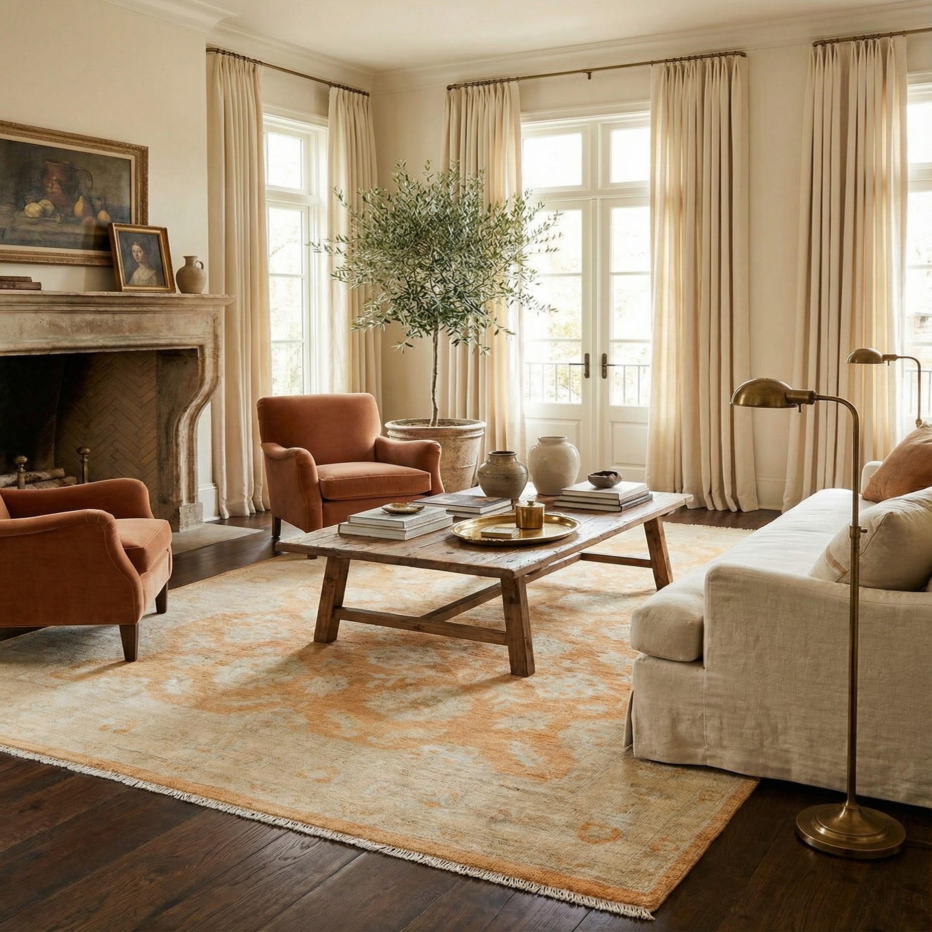Hand-knotted of 100% hand-spun wool, the surface has a soft, tactile feel with a low-luster, matte finish and subtle variations in color and texture from the hand-spun yarns. Place it beneath a seating group to anchor a living room, layer it with warm wood furniture and leather seating for a classic look, or use it to add warmth and pattern to a bedroom or study. It also pairs well with neutral, modern pieces to introduce a touch of traditional patterning without overwhelming the space.