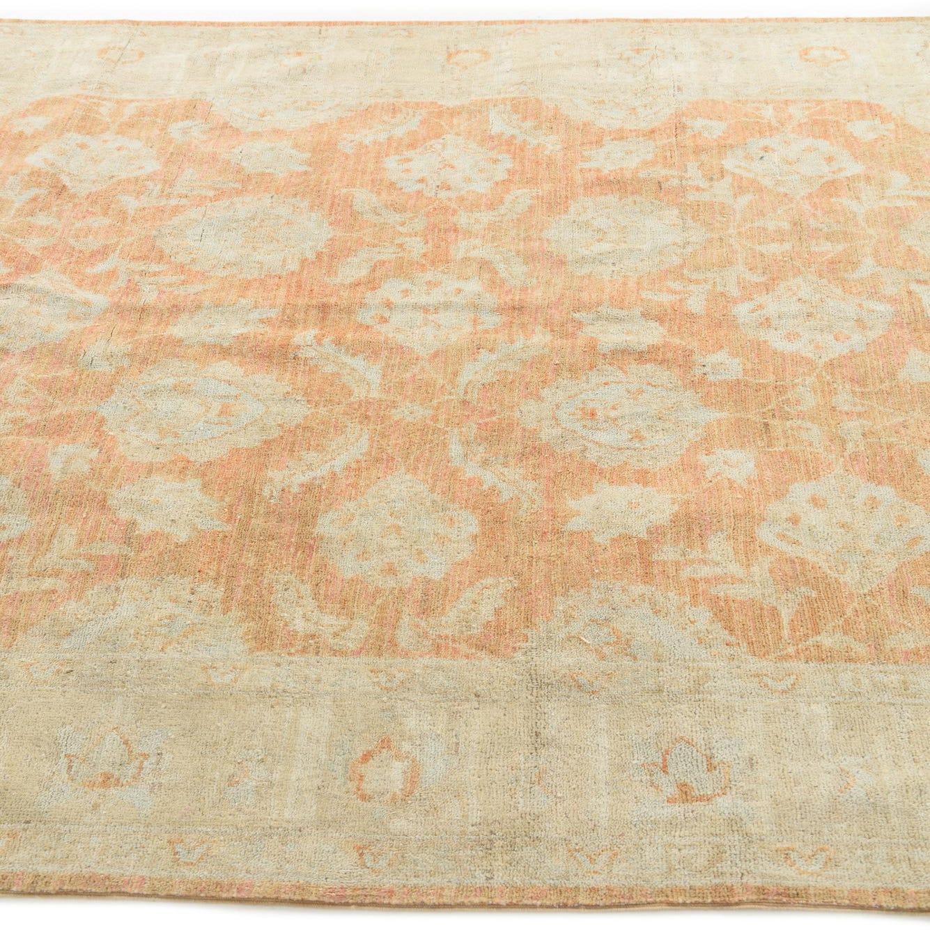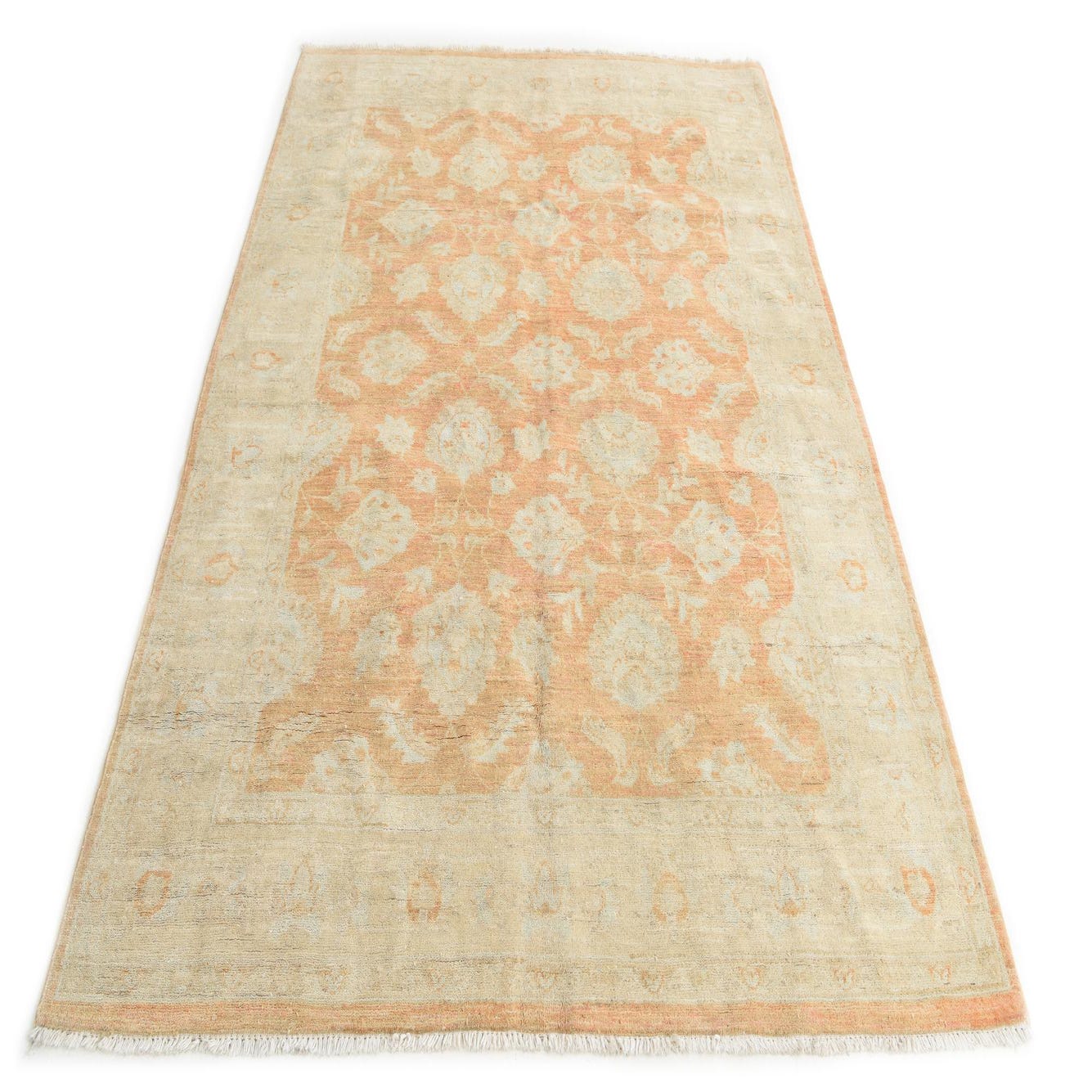 A 5x8 rectangular Peshawar Ziegler rug featuring a traditional orange and red floral pattern with a light border, made from hand-spun wool.