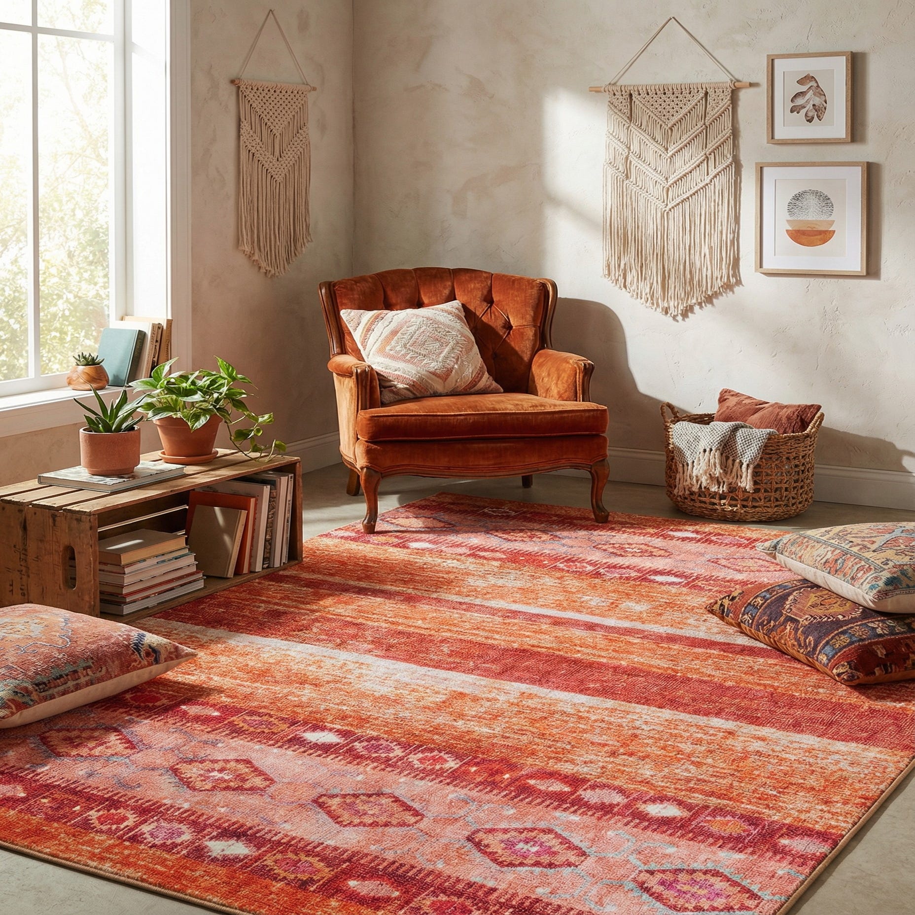 This rug works well wherever you want to introduce warm color and pattern without overwhelming a room — under a coffee table in a casual living room, layered at the foot of a bed, or in an entryway to warm hardwood floors. Pair it with warm woods, leather seating, rattan accents, and neutral linens for a relaxed, collected feel, or use it to anchor an eclectic or bohemian scheme with complementary jewel-toned pillows and throws.