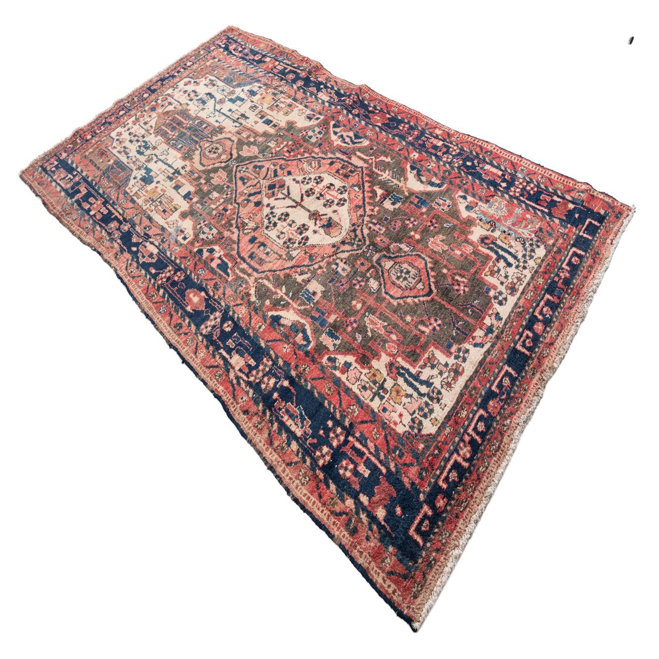 A 5x8 rectangular Persian rug with a central medallion, featuring intricate patterns in shades of orange, red, and deep blue.