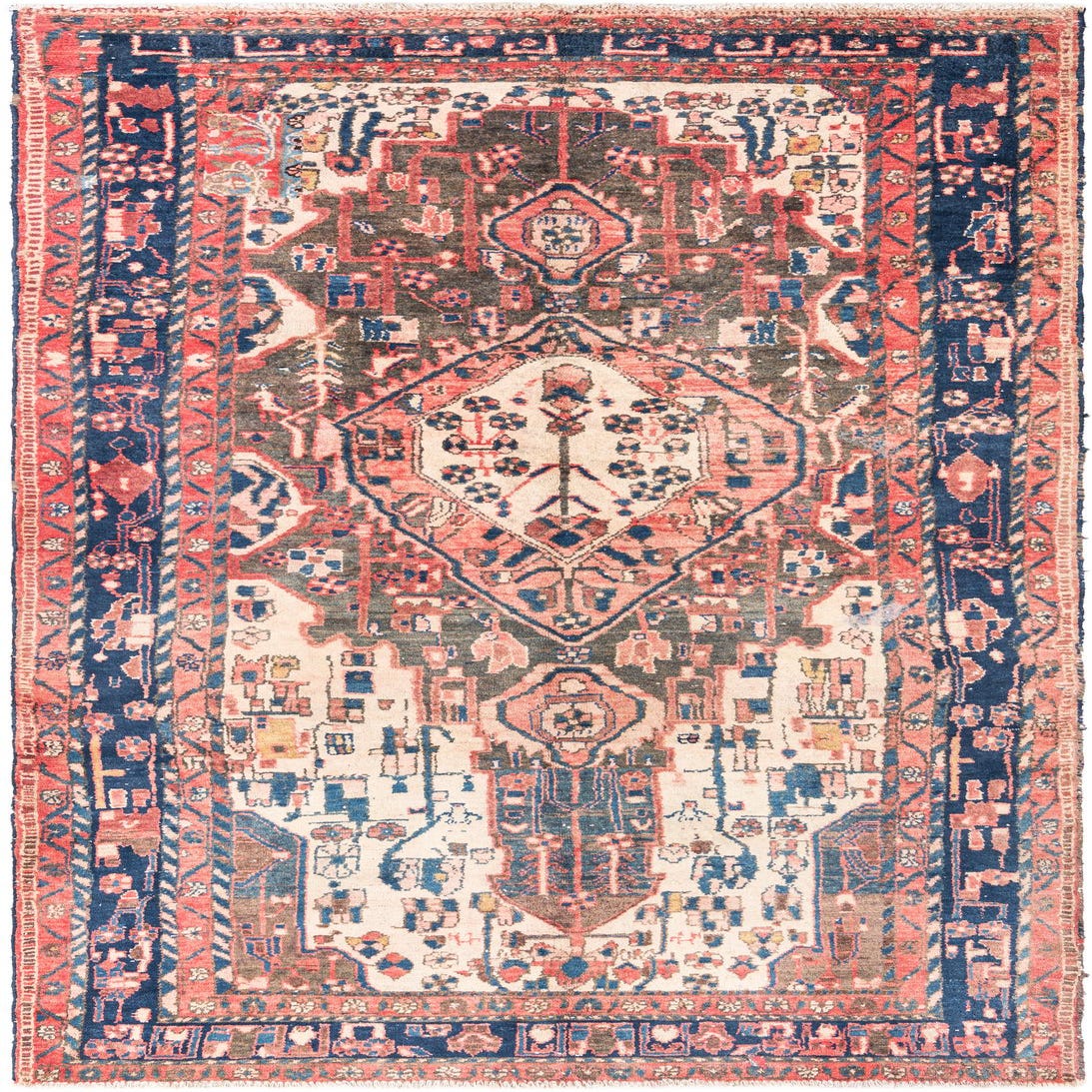 Primary color is Rust Red. Colors in this rug include: Rust Red, Brown, Navy Blue, Light Brown, Ivory.