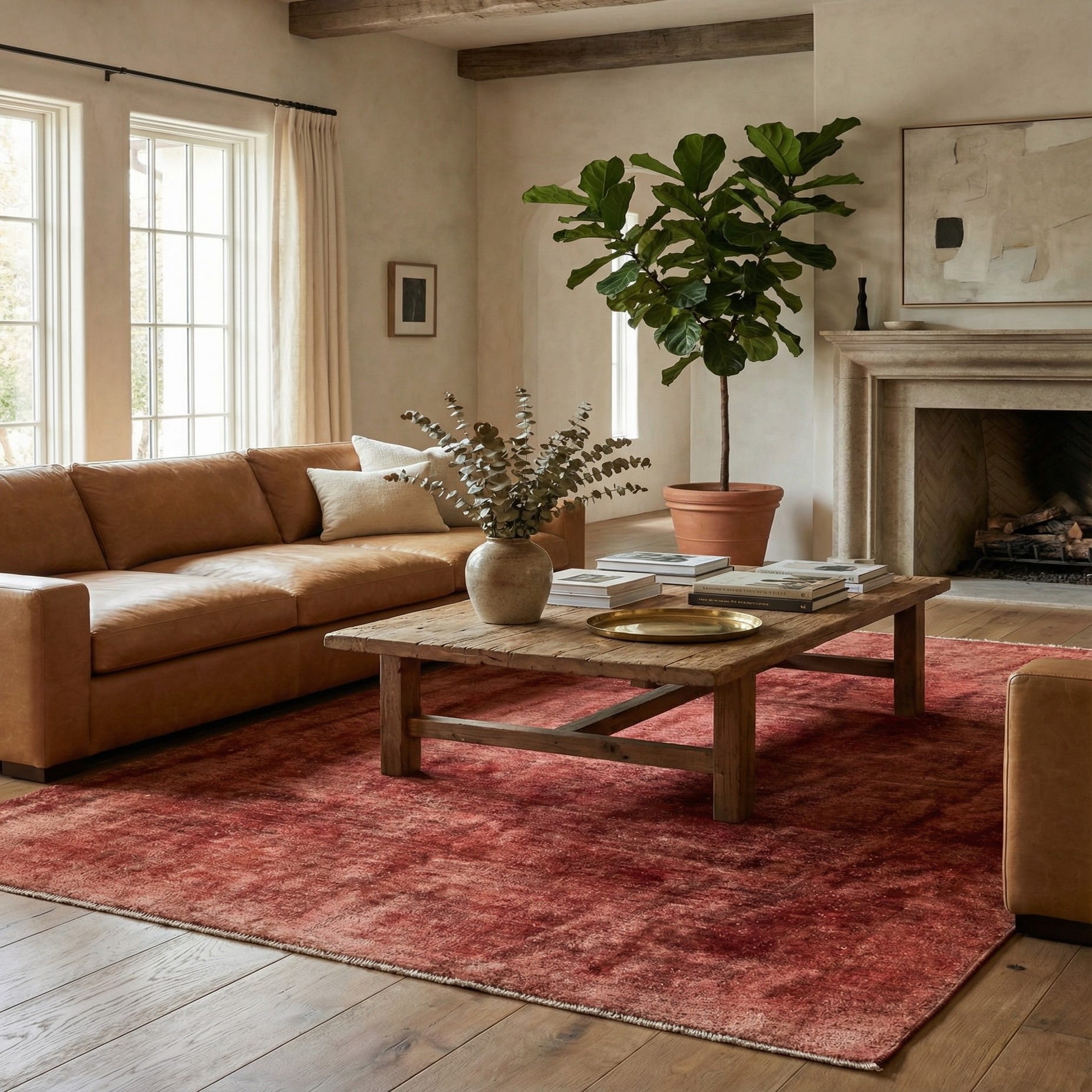 Primary color is Rust Red. Colors in this rug include: Rust Red, Beige, Brown, Red.