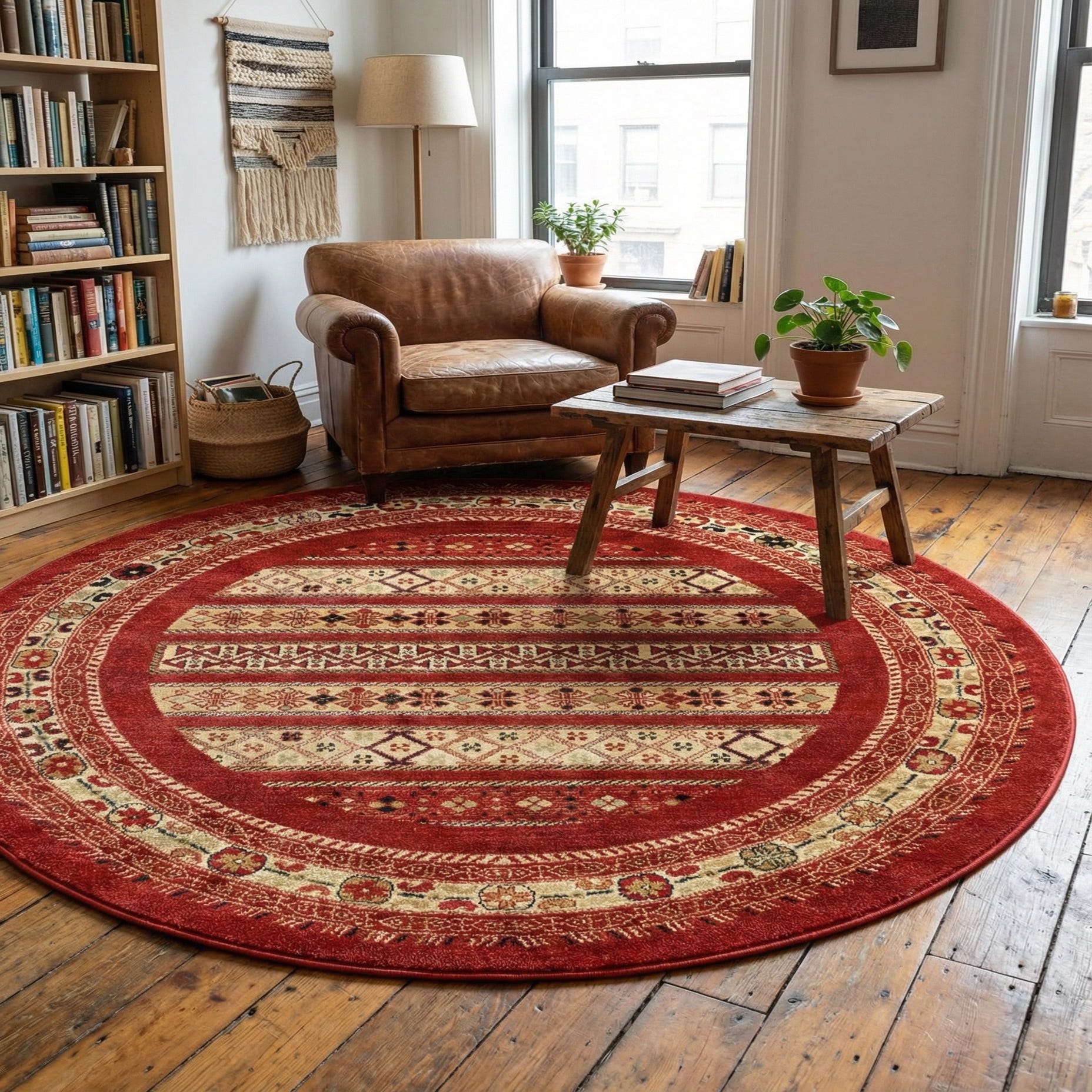 Machine made of 100% polypropylene, the rug has a dense, low pile with a smooth, slightly lustrous finish that feels soft underfoot and maintains a neat silhouette. Place it beneath a round dining table to reinforce the room’s geometry, anchor a compact seating area with a coffee table, or add a welcoming pop of color in an entry or study. It pairs especially well with warm wood tones, leather seating, neutral linen upholstery, and mixed-pattern accents for traditional, transitional, or globally inspired interiors.