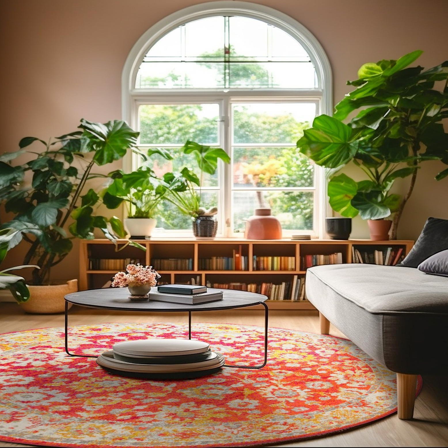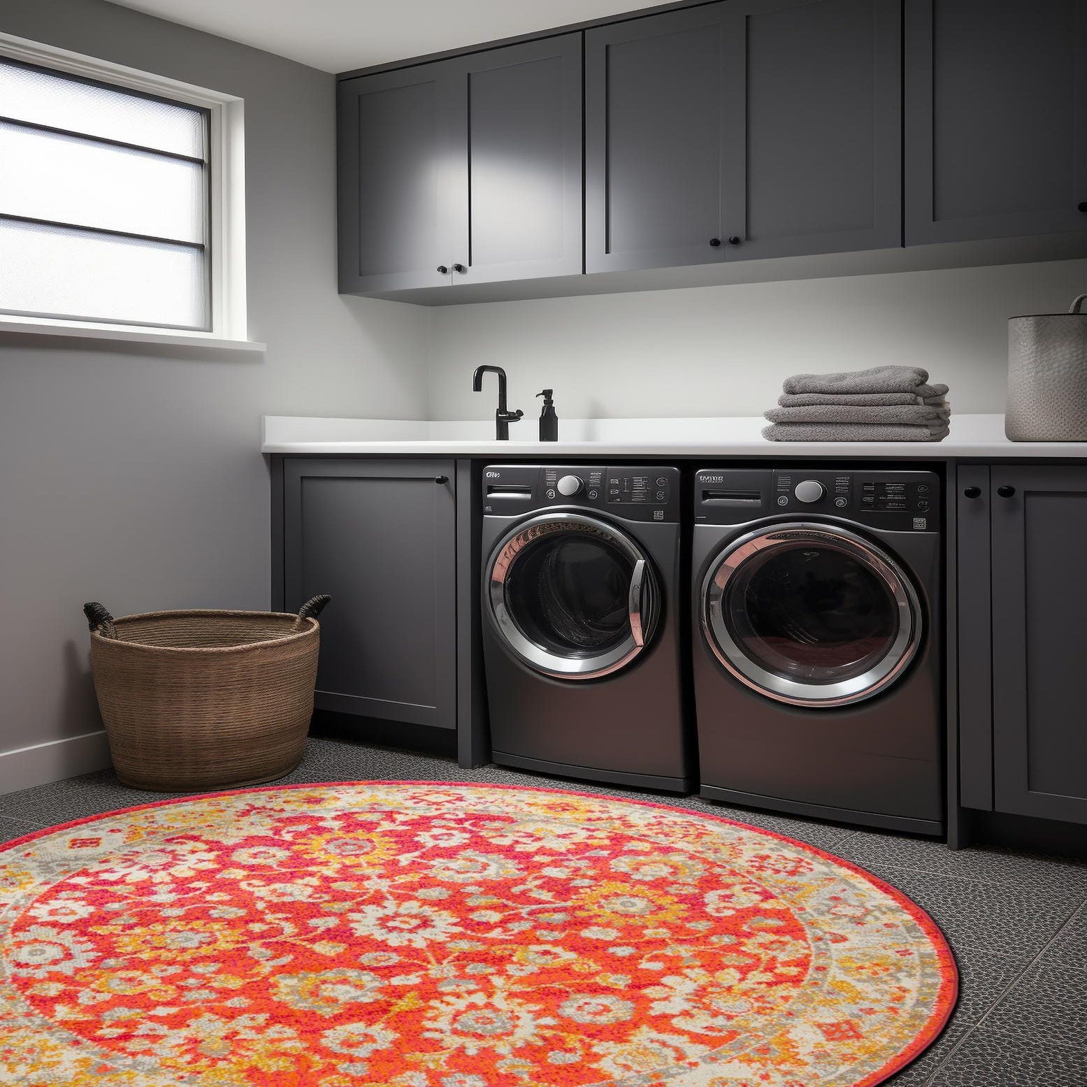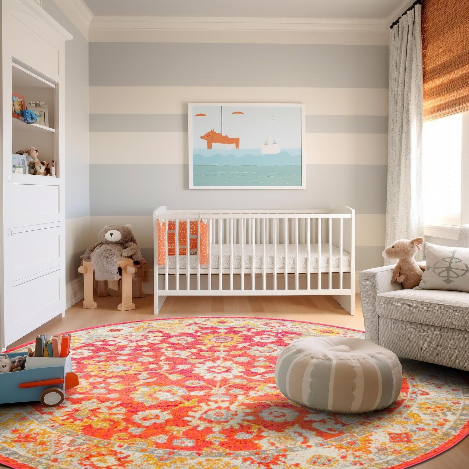 Ideal for areas such as living rooms, dining spaces, or foyers, the Madeline rug's round shape and engaging color scheme would pair well with neutral and earth-toned furnishings, enhancing spaces with ample natural light or complementing understated, minimalistic themes. It can also serve as a focal point in monochromatic or muted settings, where a pop of color is desired to create visual interest.