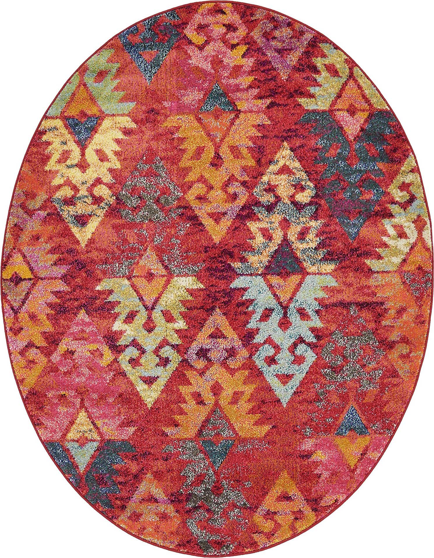 Primary color is Rust Red. Colors in this rug include: Rust Red, Black, Green, Orange, Red, Light Blue, Yellow, Violet, Pink.
