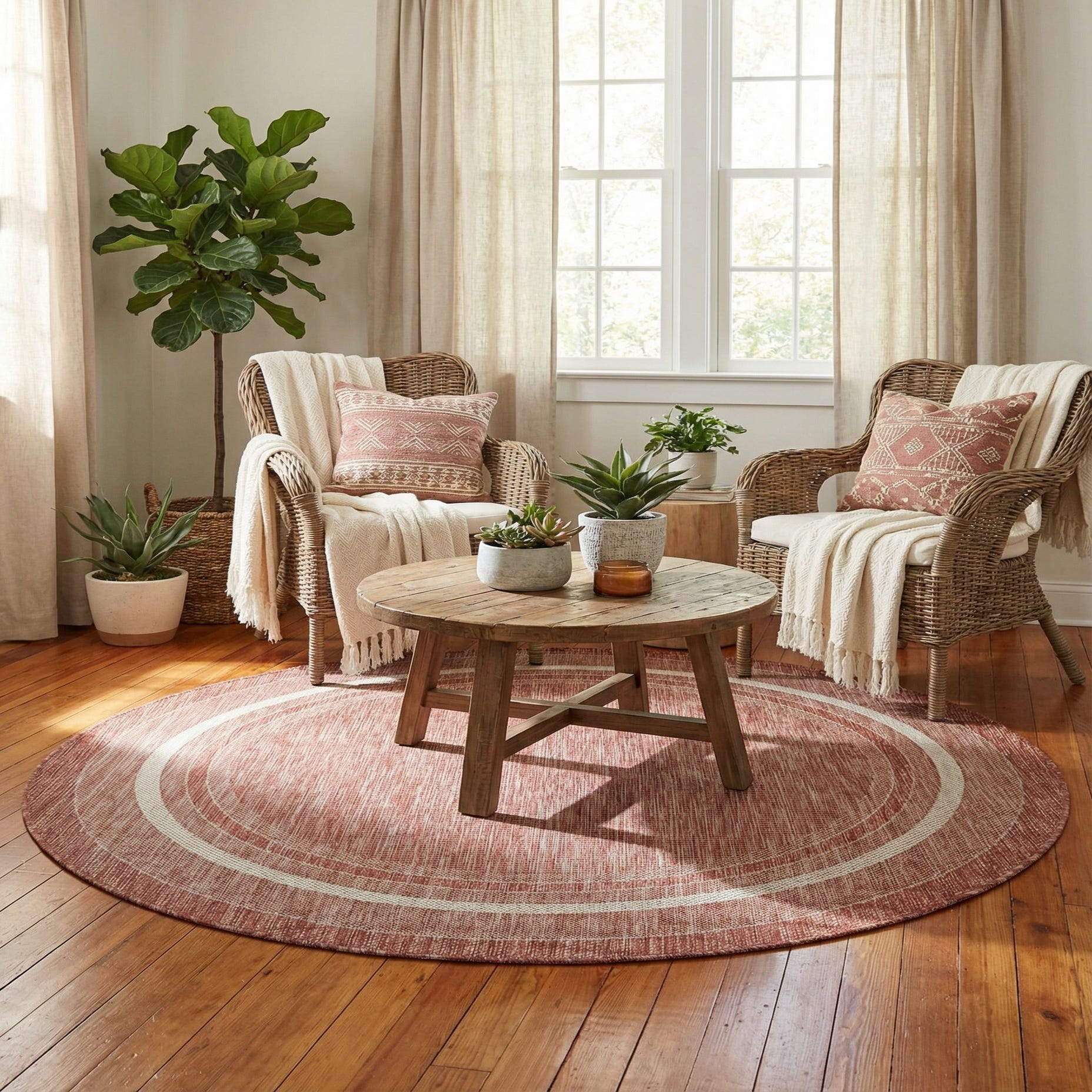 This Outdoor Border Collection rug is a 6-foot round area rug crafted with 100% polypropylene, offering a durable and easy-to-maintain option for both outdoor and indoor spaces. The rug features a background color of rust red, which provides a warm and inviting foundation. Complementing the rich base are bands of beige that create a simple yet elegant border pattern. The flatweave construction results in a rug that is tactile, with a smooth surface that suits a variety of decor styles.