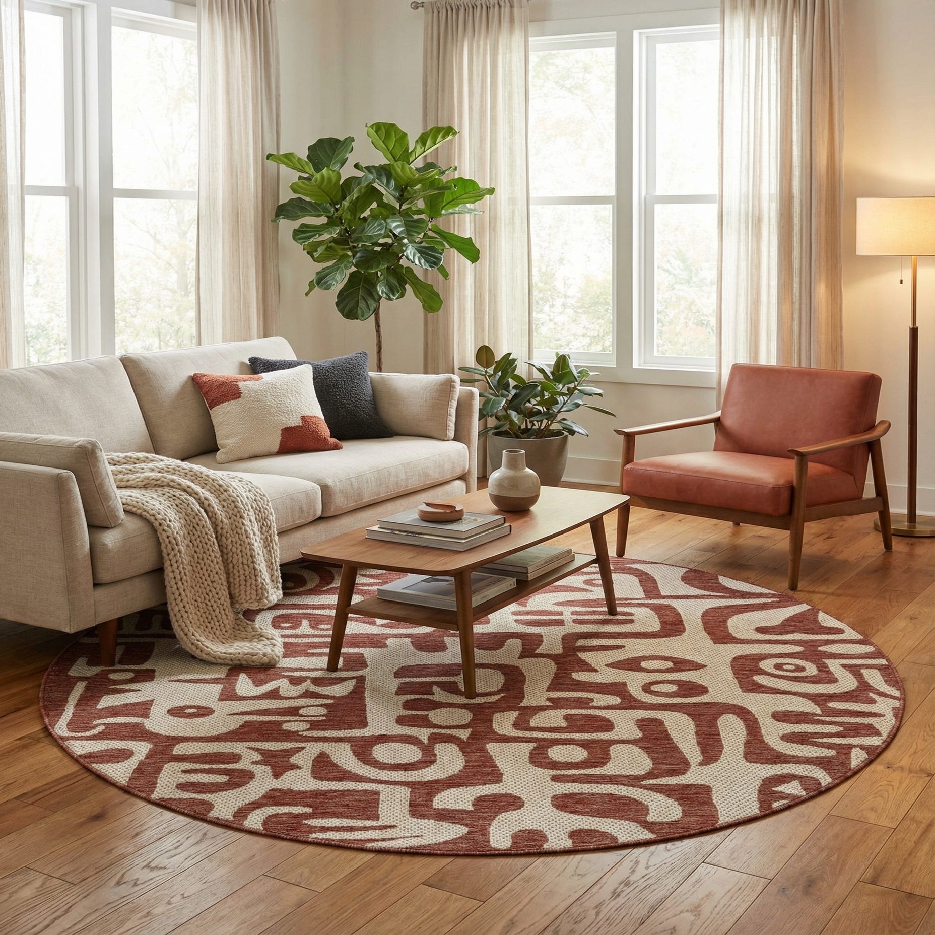 A graphic, modern pattern of glyph-like shapes sits boldly against a rust red background, with light neutral forms creating lively contrast across the round silhouette. The design reads as abstract and contemporary, with hand-drawn curves and blocky marks that give the surface visual depth. Machine made of 100% polypropylene, the rug has a low-profile, tightly woven texture with a subtle ribbed feel underfoot that balances smoothness with a touch of tactile interest.