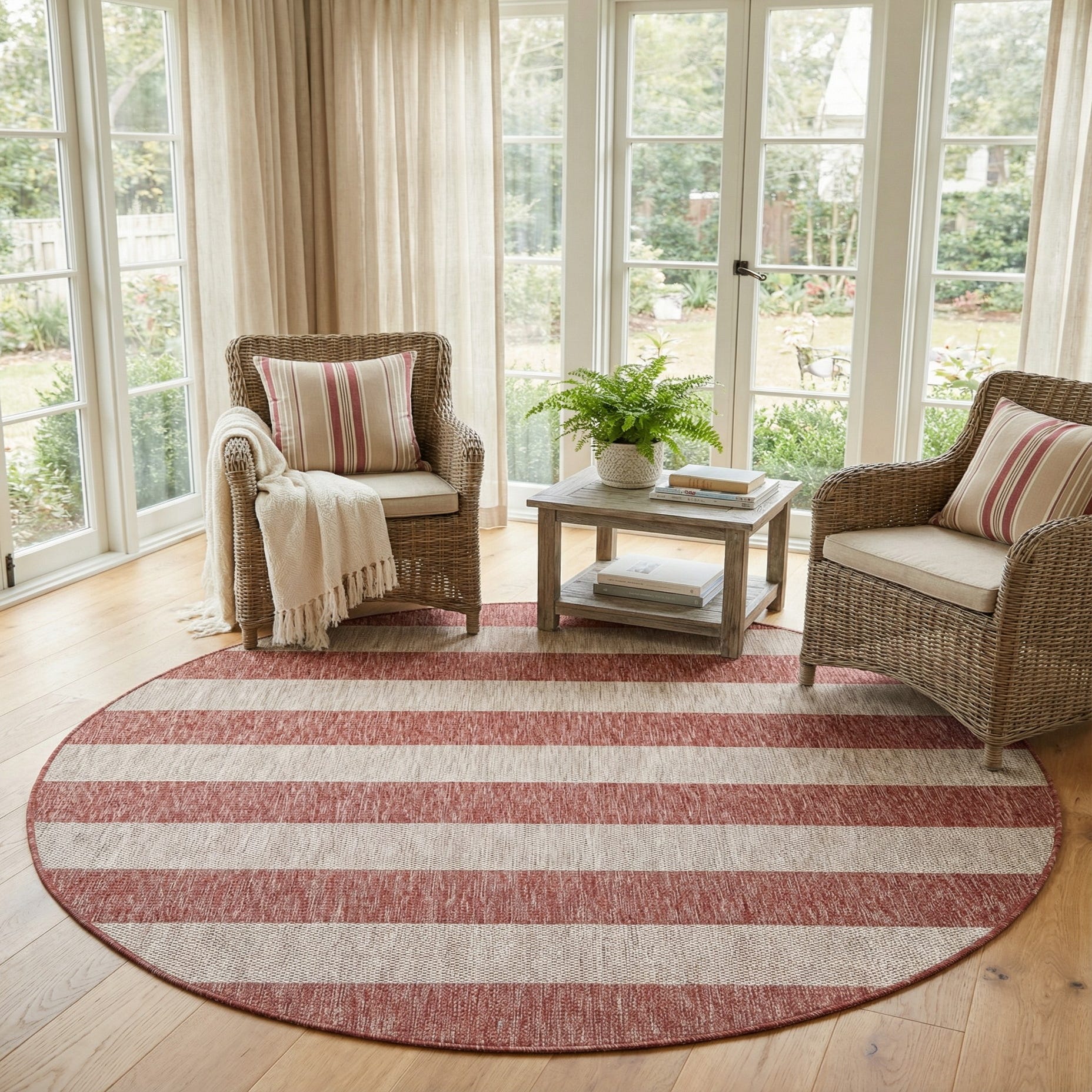 Its straightforward, contemporary look works well in casual modern, coastal, or farmhouse interiors. Use it to define a round dining nook, anchor a sunroom seating area, or place it on a covered patio beneath a bistro set. The warm rust pairs naturally with oak or walnut tones and rattan, while the gray stripes coordinate with metal accents and neutral textiles for a balanced, lived-in feel.