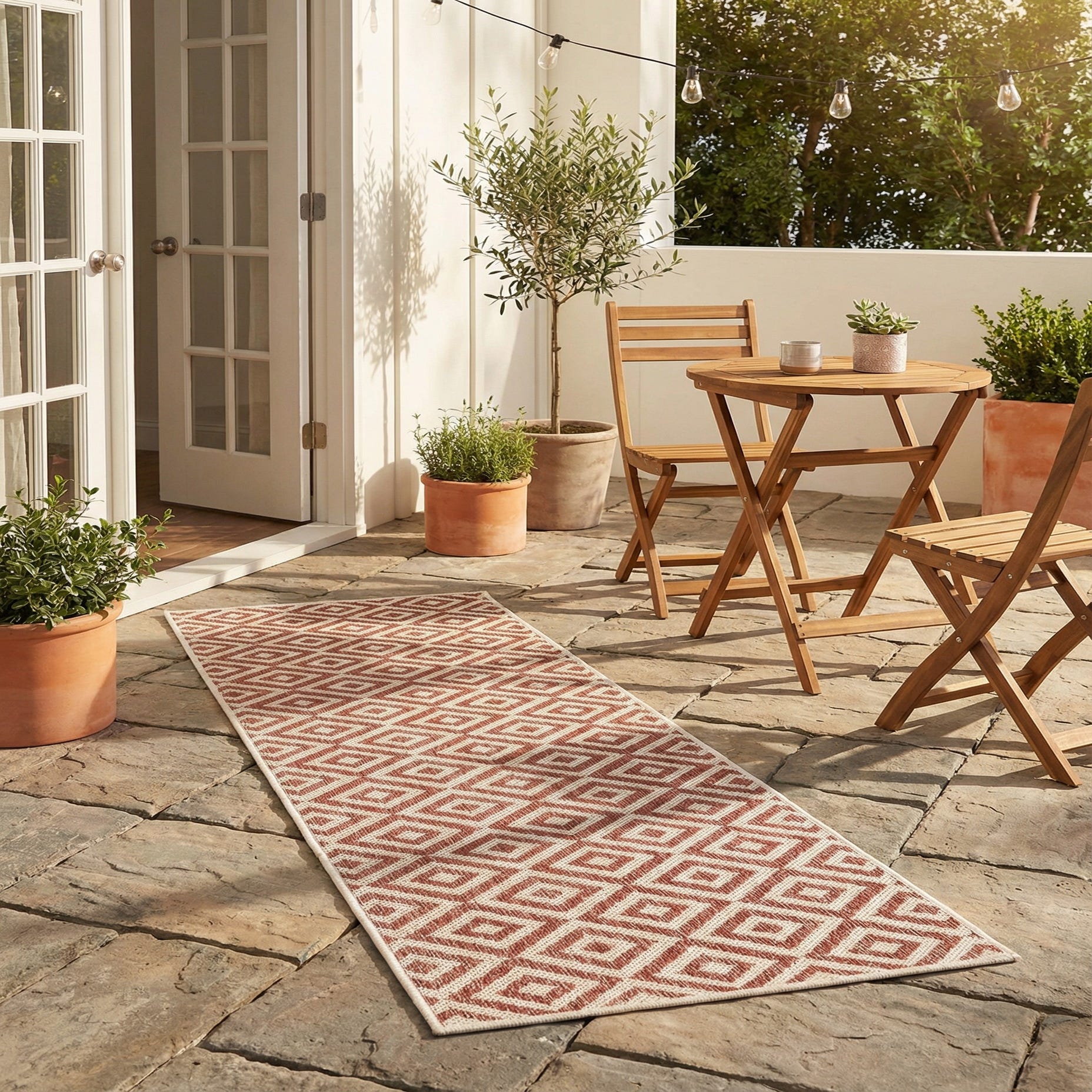 Machine-made from 100% polypropylene, this outdoor runner pairs a rust-red ground with a repeating ivory diamond motif for a clean, geometric look. The woven construction creates a low-profile, slightly textured surface you can feel underfoot—firm yet tactile—so the diamond pattern holds crisp edges across the length of the piece. The two-tone palette balances warmth and brightness: the rust-red background anchors a space while the ivory pattern lifts and lightens the overall look.