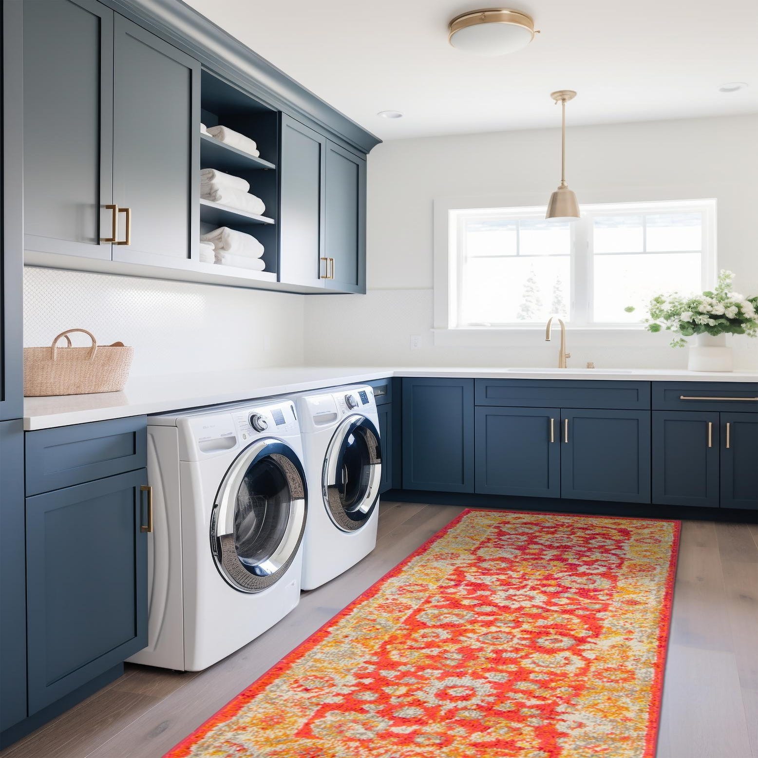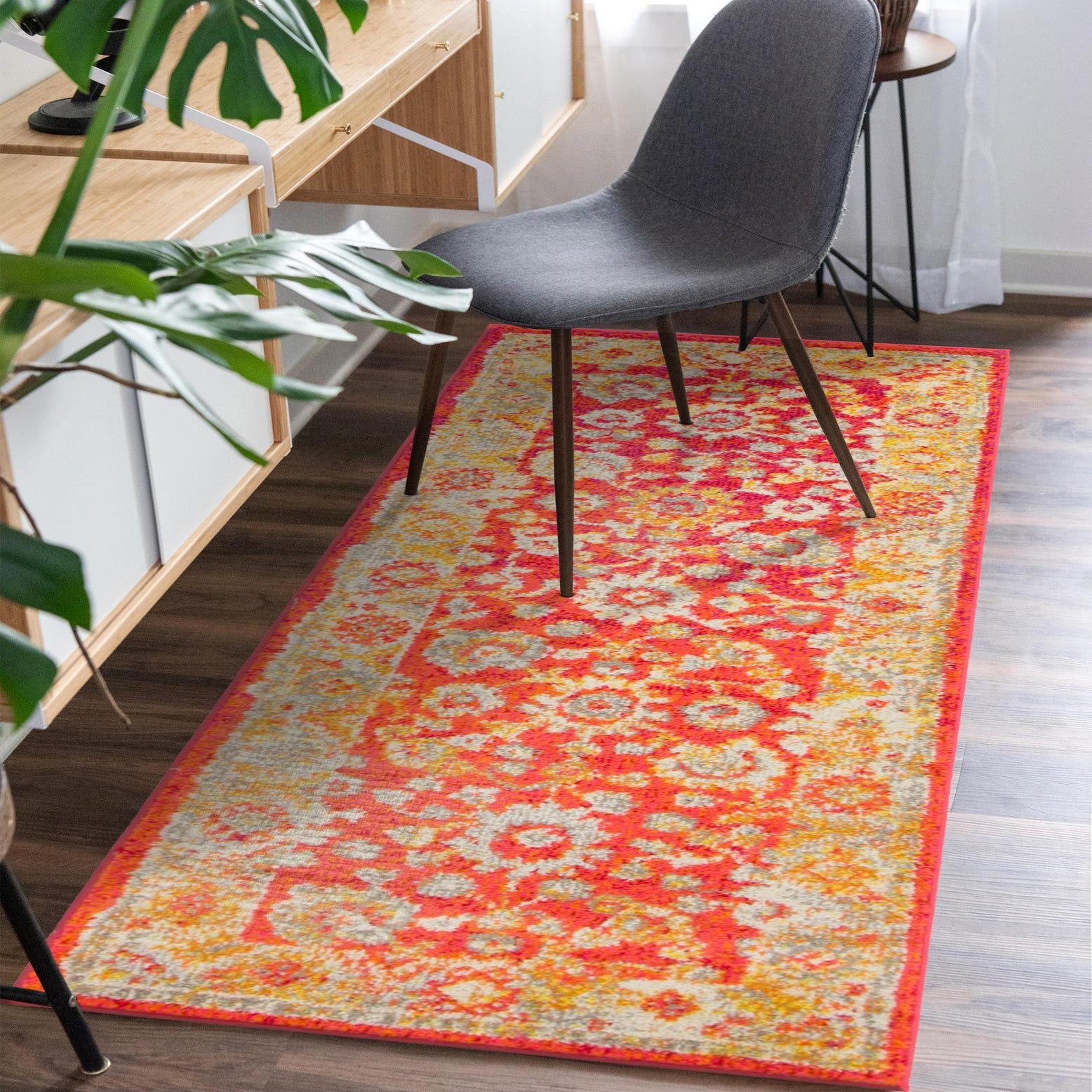 Primary color is Rust Red. Colors in this rug include: Rust Red, Gold, Gray, Ivory, Pink, Red.