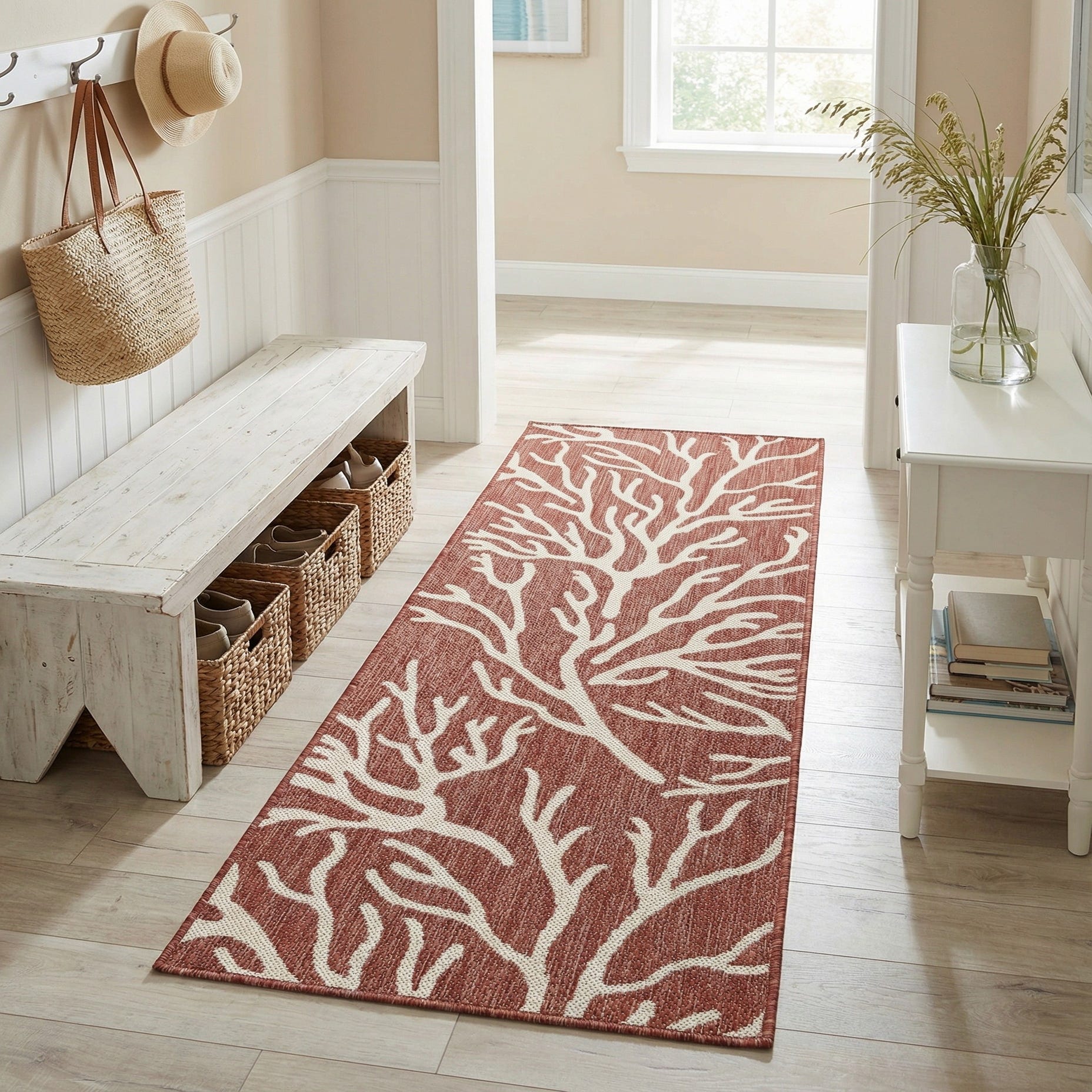 A flowing coral-branch motif in ivory spreads across a warm rust red ground, giving the runner a natural, graphic presence. The machine-made construction uses 100% polypropylene in a low, tightly woven finish that feels firm underfoot with a subtle textured surface you can both see and feel. The contrast between the ivory pattern and the rust background reads clean and coastal without being ornate.