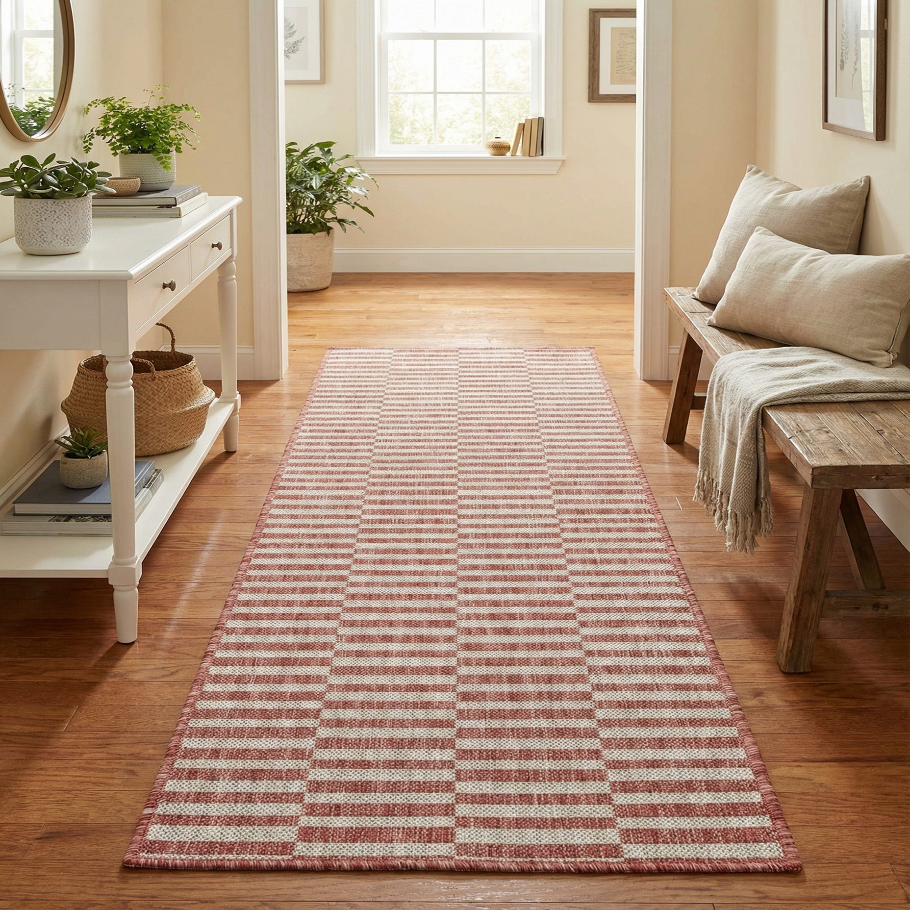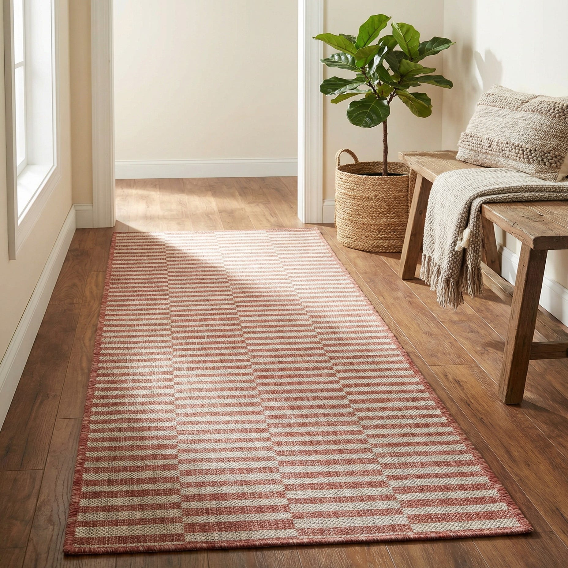 A rhythmic ribbon pattern crosses a warm rust red ground, where narrow ivory bands are woven in regular, stacked rows to form a linear, checkerboard-like motif. The design reads clean and architectural while retaining a handcrafted look thanks to subtle variations in the weave. Machine-made from 100% polypropylene, the runner has a low, flat profile with a slightly textured hand that feels firm underfoot and lays smoothly in narrow spaces.