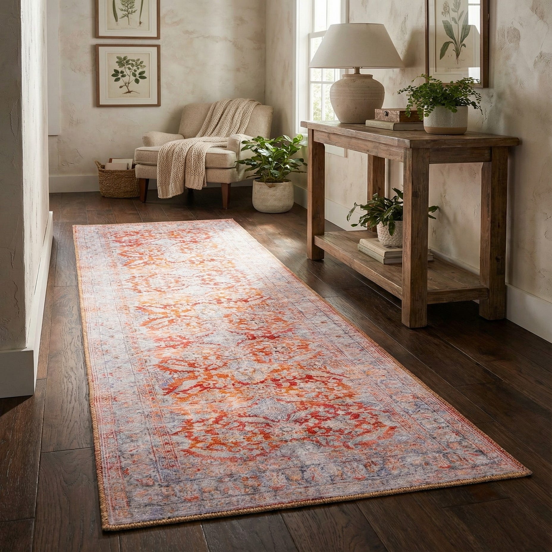 Place this runner in a hallway or entry to introduce color and pattern to a narrow space, use it alongside a bed as a bedside runner, or anchor a kitchen aisle for added warmth. The rust and orange tones pair well with warm wood floors and brass accents, while the ivory and violet highlights coordinate with cool neutrals or jewel-toned decor. It complements transitional, bohemian, and contemporary interiors and also works as a lively accent in more minimalist rooms.