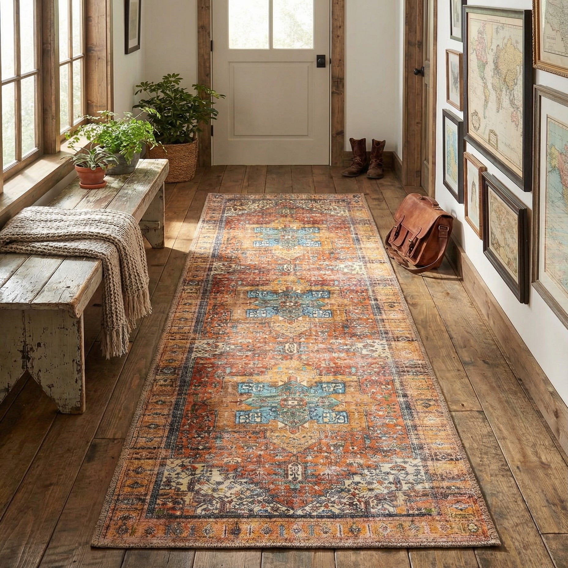 Machine-made of 100% polyester, the rug has a low, smooth pile that feels soft underfoot while maintaining a neat profile in narrow spaces. Its layered colors and vintage texture work well in transitional and bohemian interiors, as a hallway or entry runner, or in a kitchen aisle. Pair it with warm wood floors and leather furniture for a grounded look, or layer it beneath a slim console and mirror to add color and pattern to an otherwise neutral corridor.